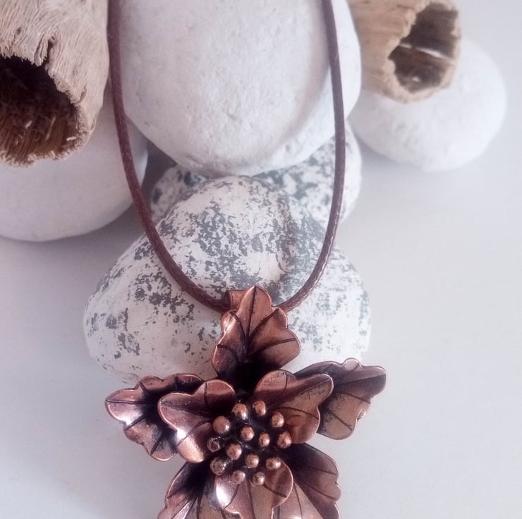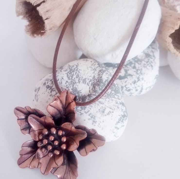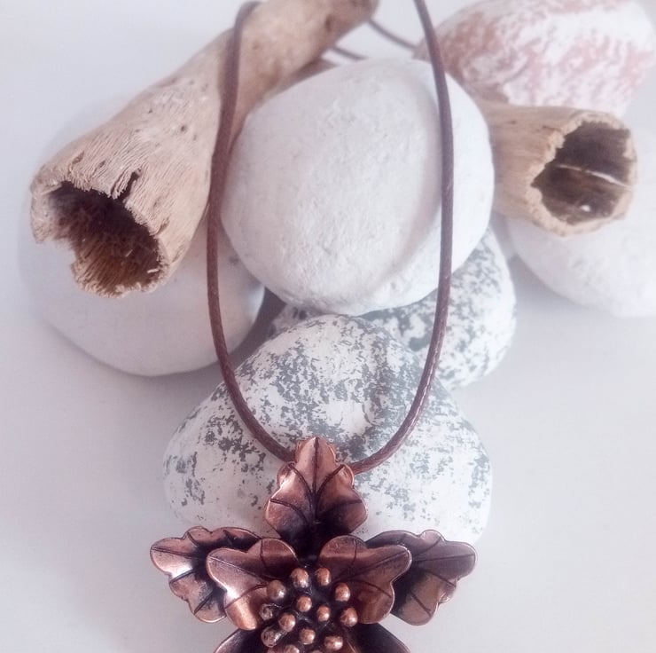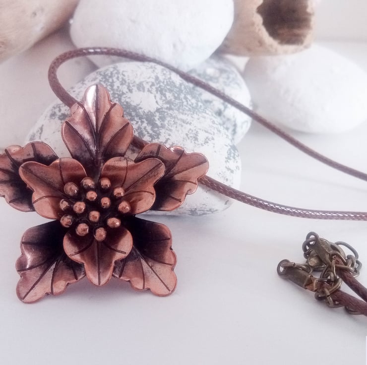 This necklaces features an antique copper plated 40mm leaf flower pendant.
