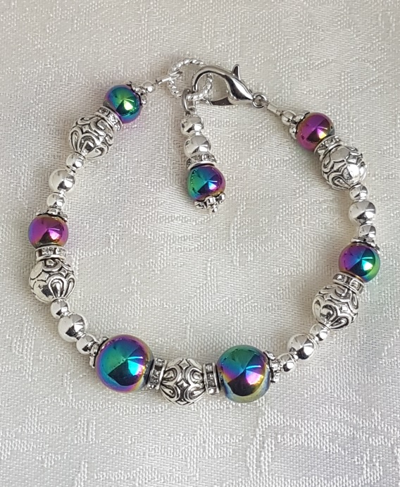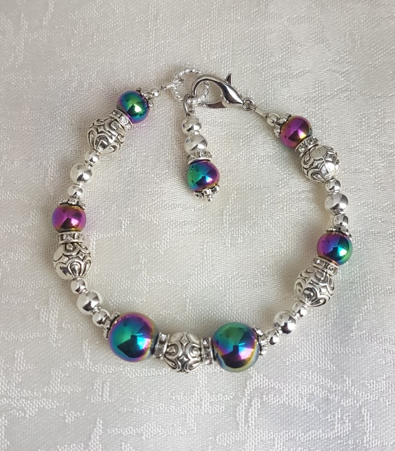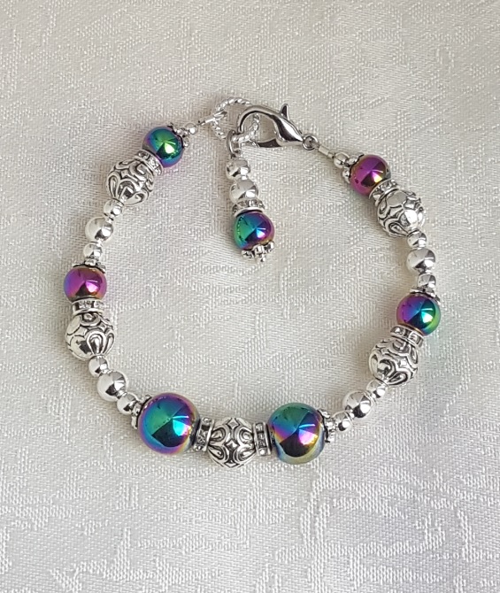 Beads are Rainbow Haematite, Silver tone patterned beads and Silver plated plain beads.