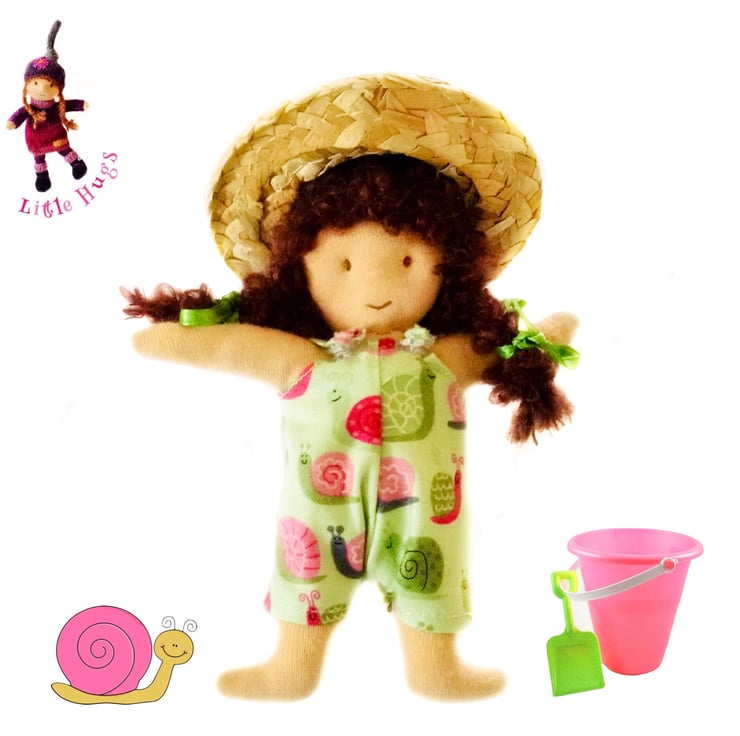 The cutest little pair of short cotton dungarees in a delightful snail print made especially to fit the Little Hugs. The dungarees are made from best quality cotton, fasten with two little poppers and come on a cute little hanger.