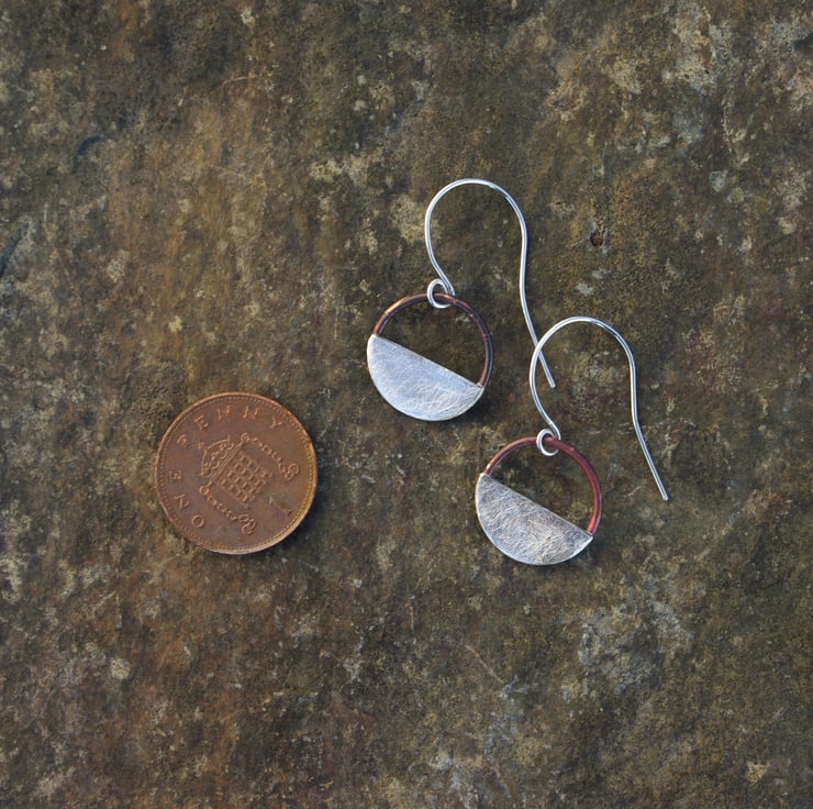 I have soldered a half moon sterling silver shape to a piece of copper wire which completes a circle . They have a diameter of 15mm which is smaller than a penny.