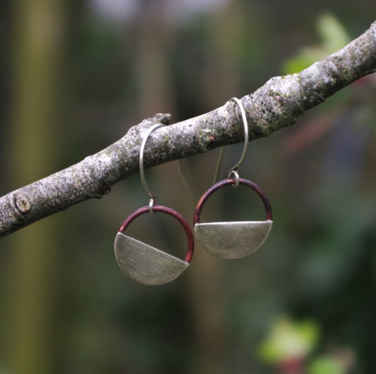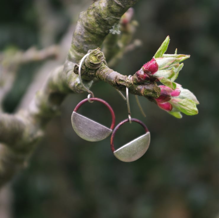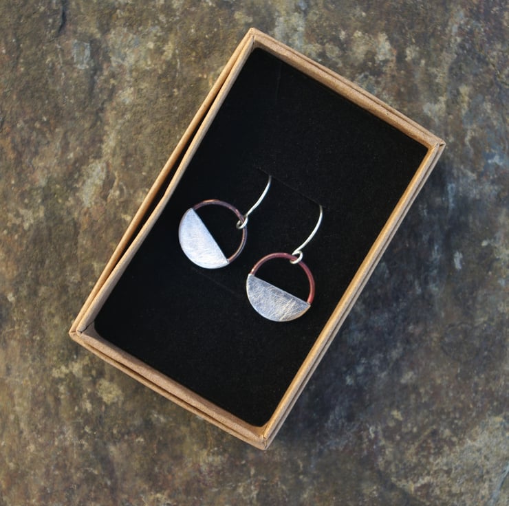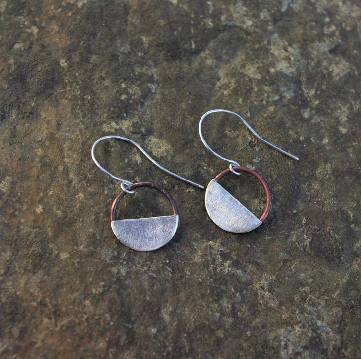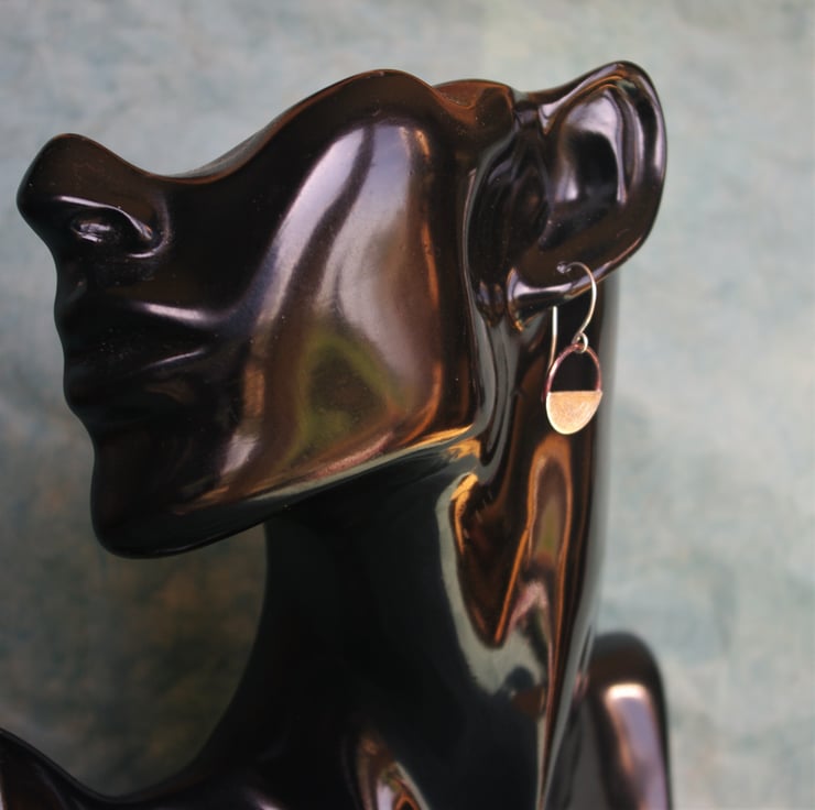 The circles hangs from handmade sterling silver ear hooks which allow them to move about , so that the straight line of the half moon brass shape does not always appear horizontal.