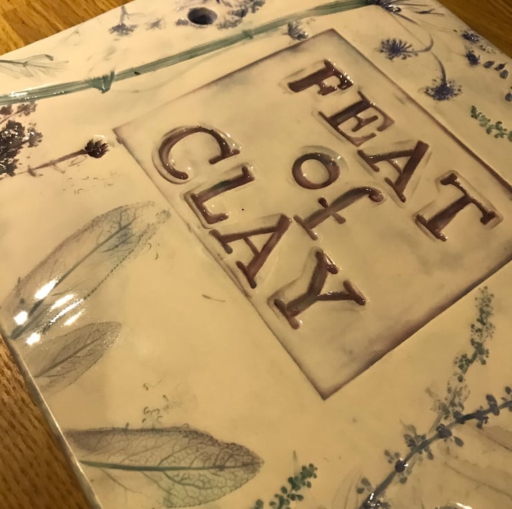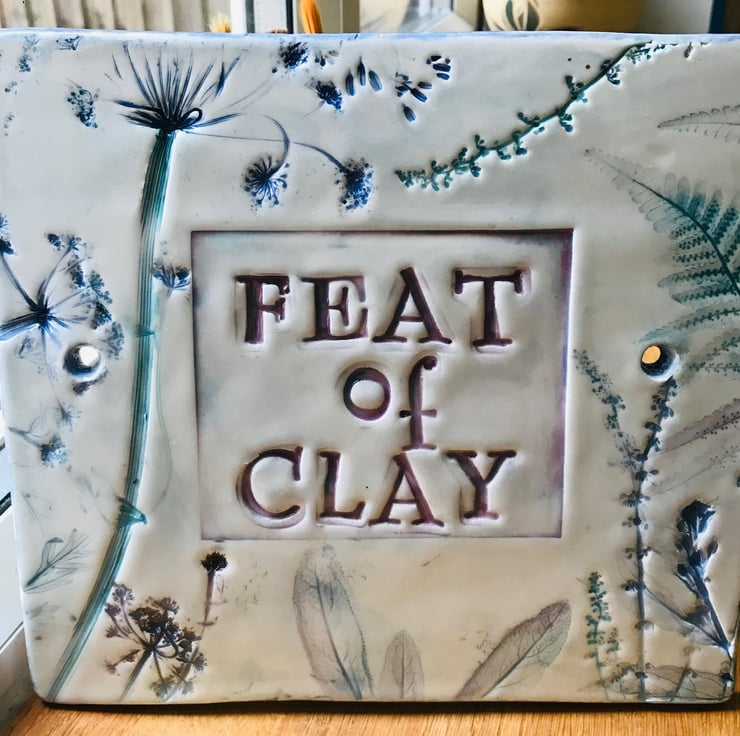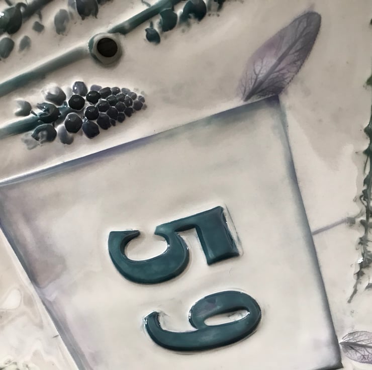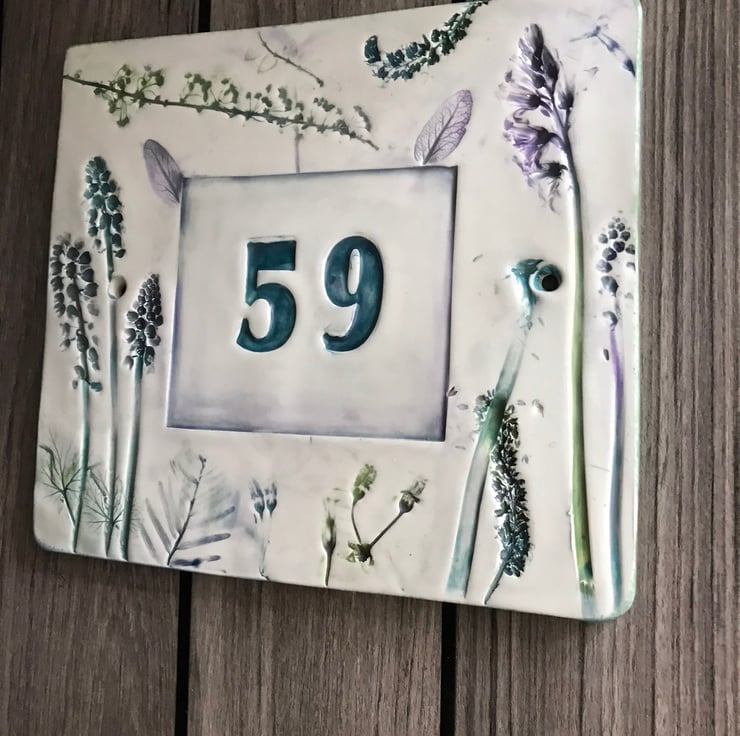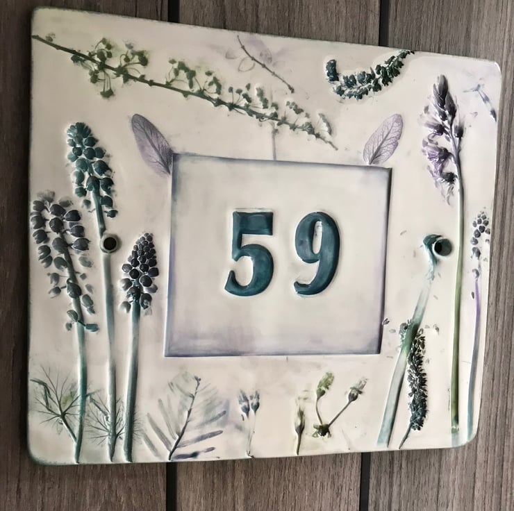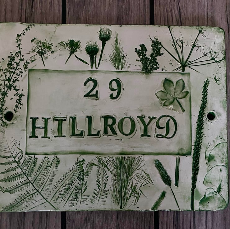 Door number or house name sign ceramic botanical nature flowers leaves impressed