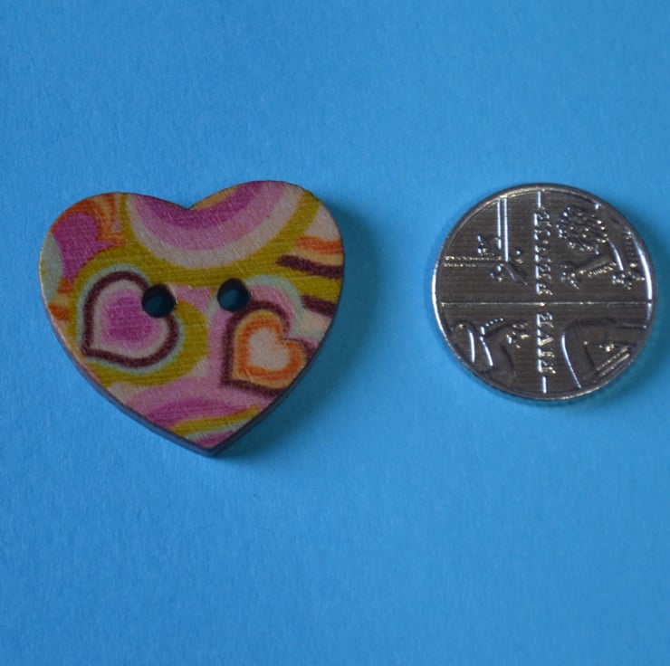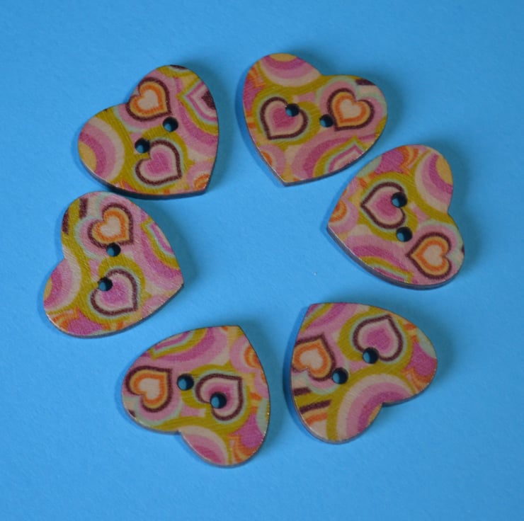 Wooden Heart Buttons Retro Pink Yellow Green Coloured 6pk 25x22mm (H22)