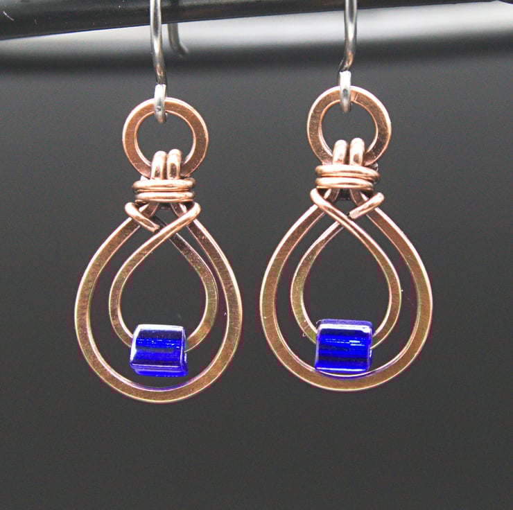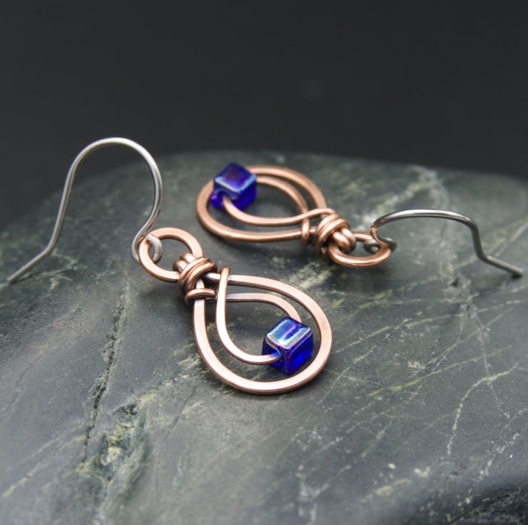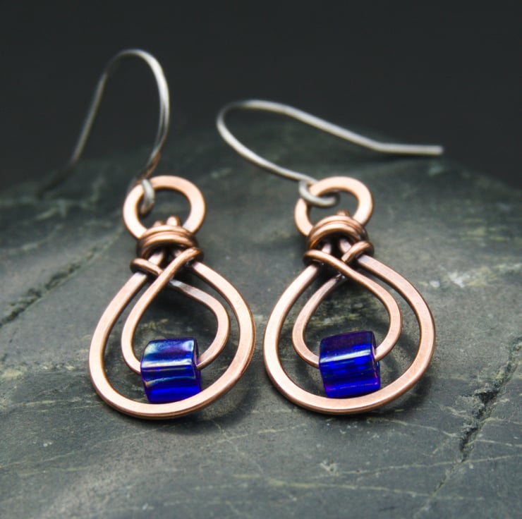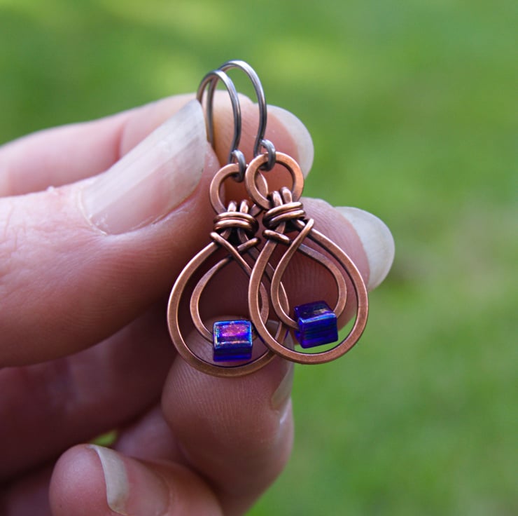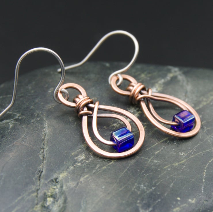 These pretty little earrings have been handmade from copper wire. A hammered teardrop shape has been formed from thicker wire & attached to a ring. The 4mm cube bead sits on a smaller teardrop made from finer wire, which has then been woven inside the larger shape. The beads are a cobalt blue colour, with an AB coating, which gives them a slight mirror finish when the light catches them.