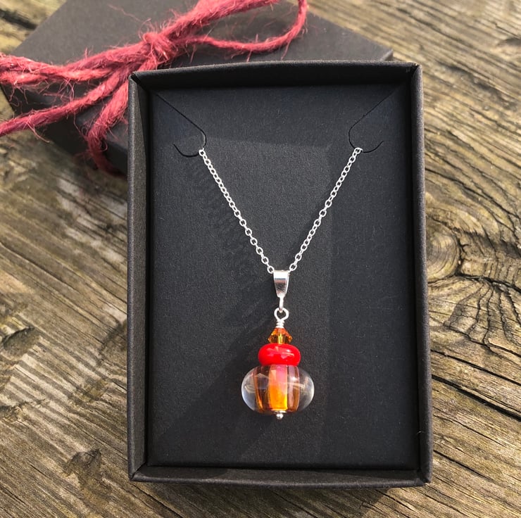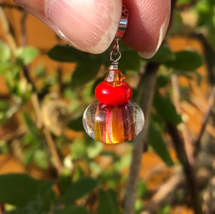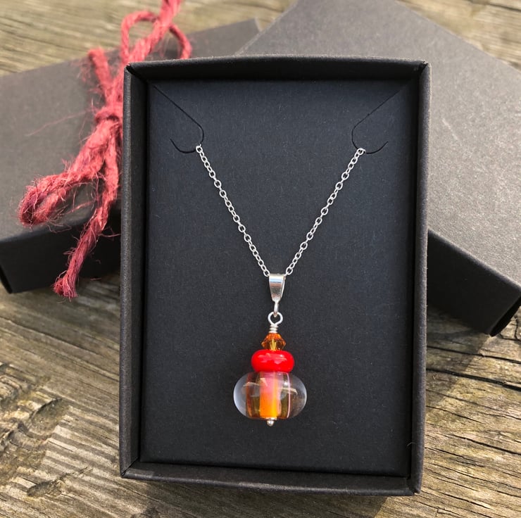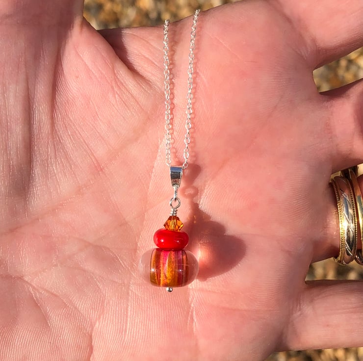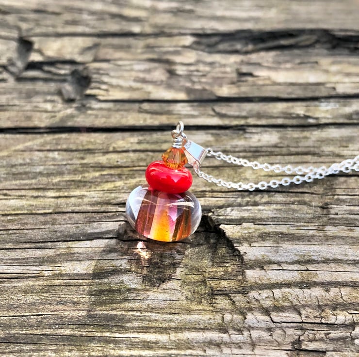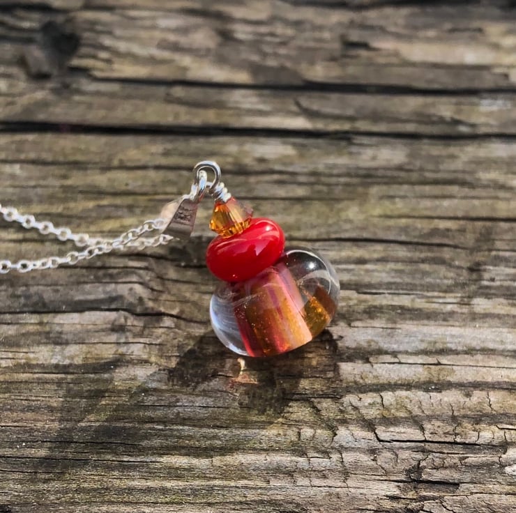 This stunning lampwork glass bead featuring red & orange tones has been teamed with a 6mm orange Swarovski Crystal & a smaller red lampwork bead.