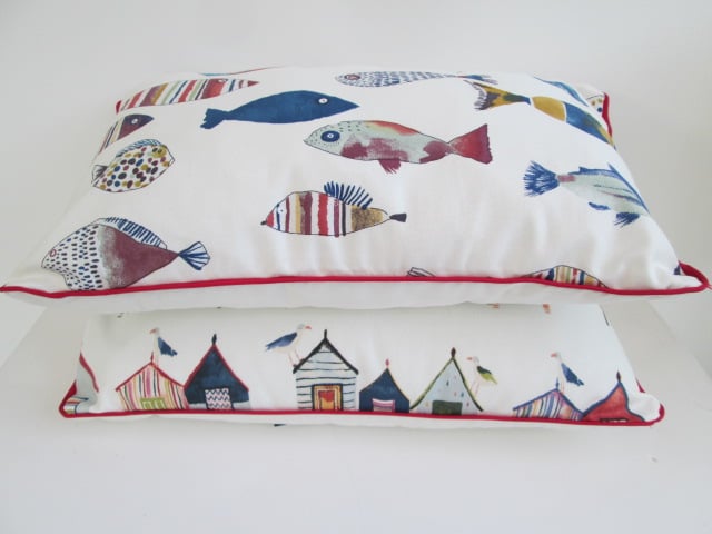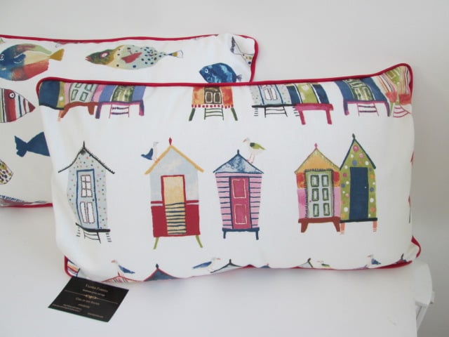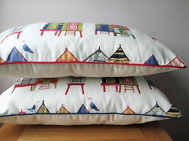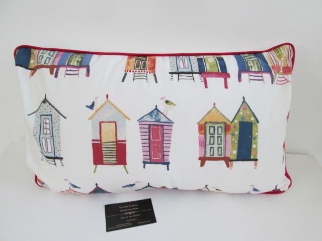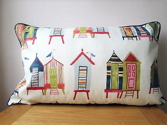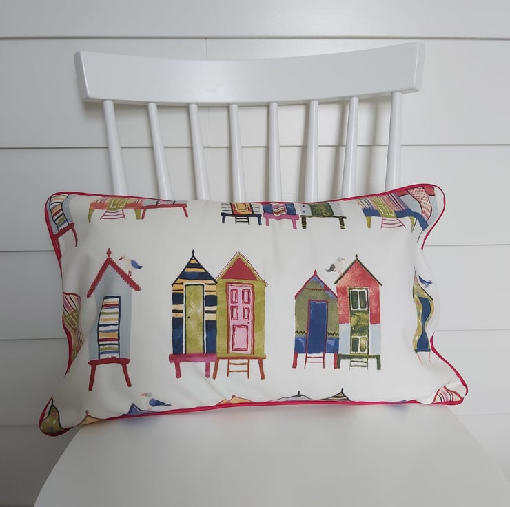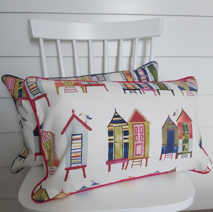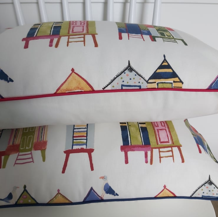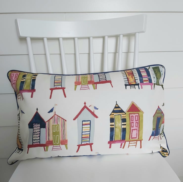 Colourful beach huts cushion cover with cream back with central zip and navy piping.
