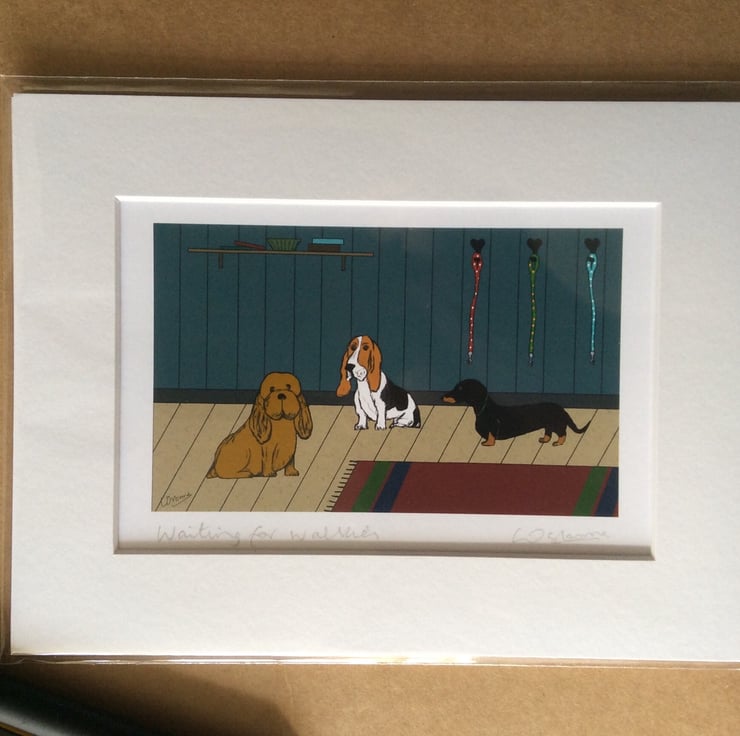 Waiting for walkies - high quality print, with mount, from one of my illustrations of dogs waiting for their daily walk.