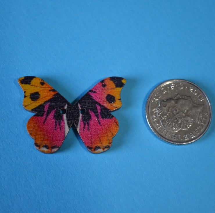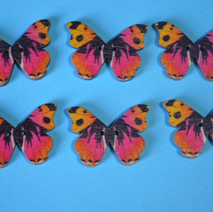 Wooden Butterfly Buttons Pink Orange Yellow Black 6pk 28x20mm (B20)