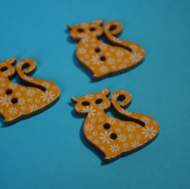 Wooden Cat Buttons Yellow Flower 3pk 30x25mm Kitty Pussy Kitten (CT11)