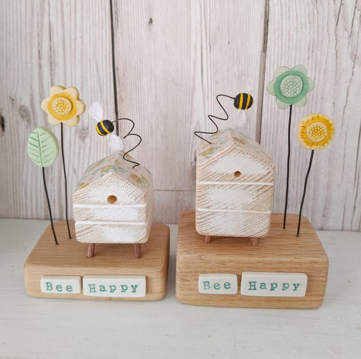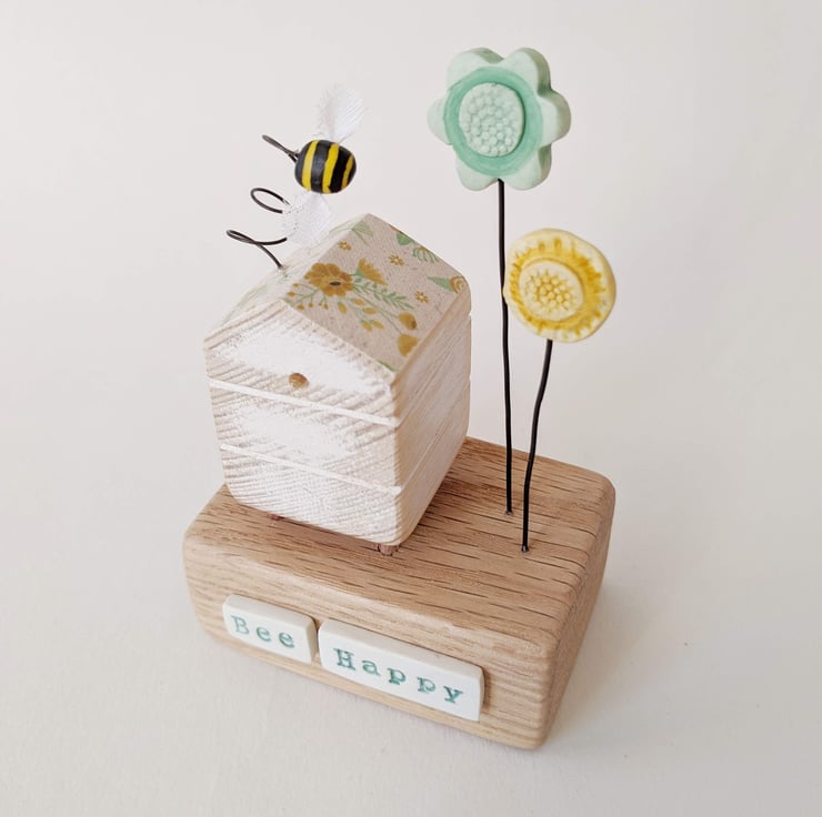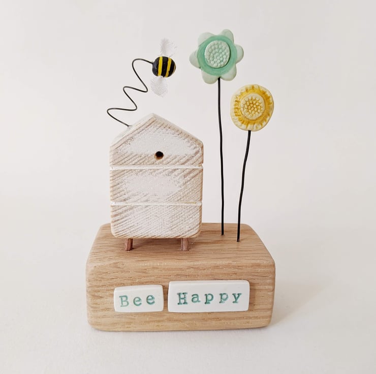 Painted white and sanded smooth the roof of the hive is adorned with flowers and the little bee dances on a bendy wire. It sits on a wooden block with a flower garden. The sign on the front reads 'Bee Happy'.