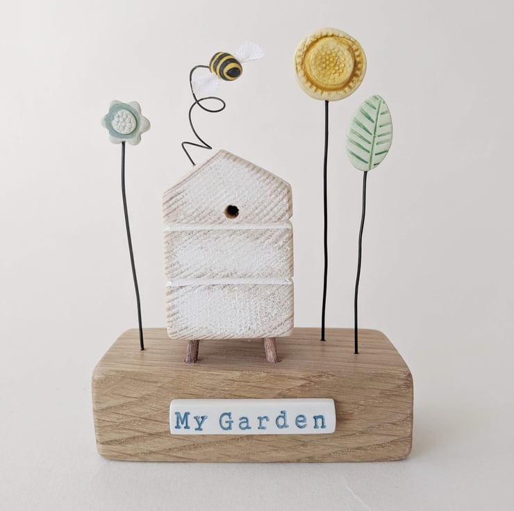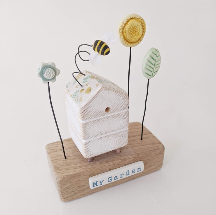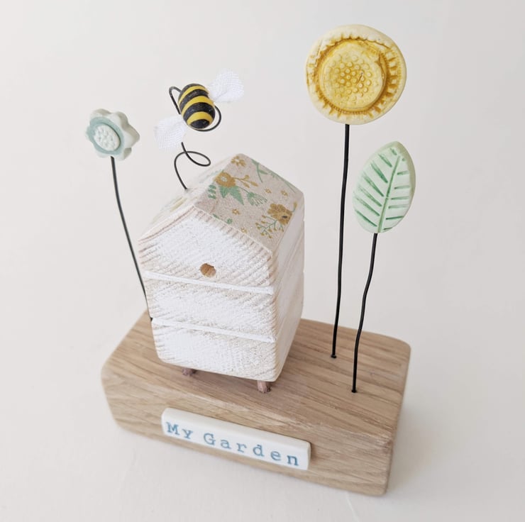 Painted white and sanded smooth the roof of the hive is adorned with flowers and the little bee dances on a bendy wire. It sits on a wooden block with a flower garden. The sign on the front reads 'My Garden'.