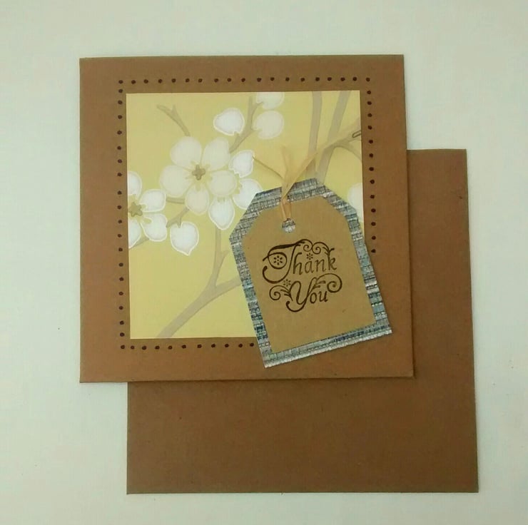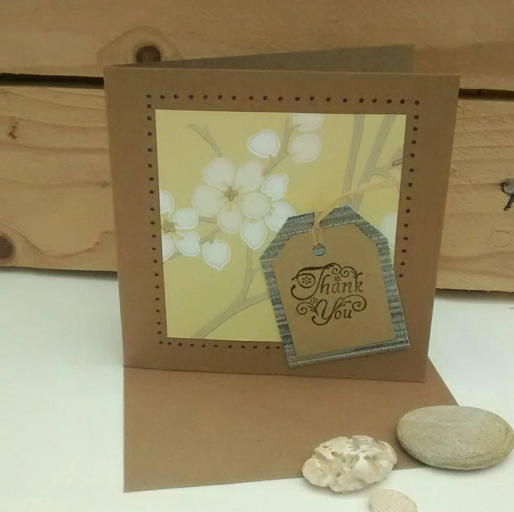 A one of a kind handmade card on recycled card stock. The card is individually hand stamped onto Kraft paper and mounted on a cherry blossom wallpaper sample.