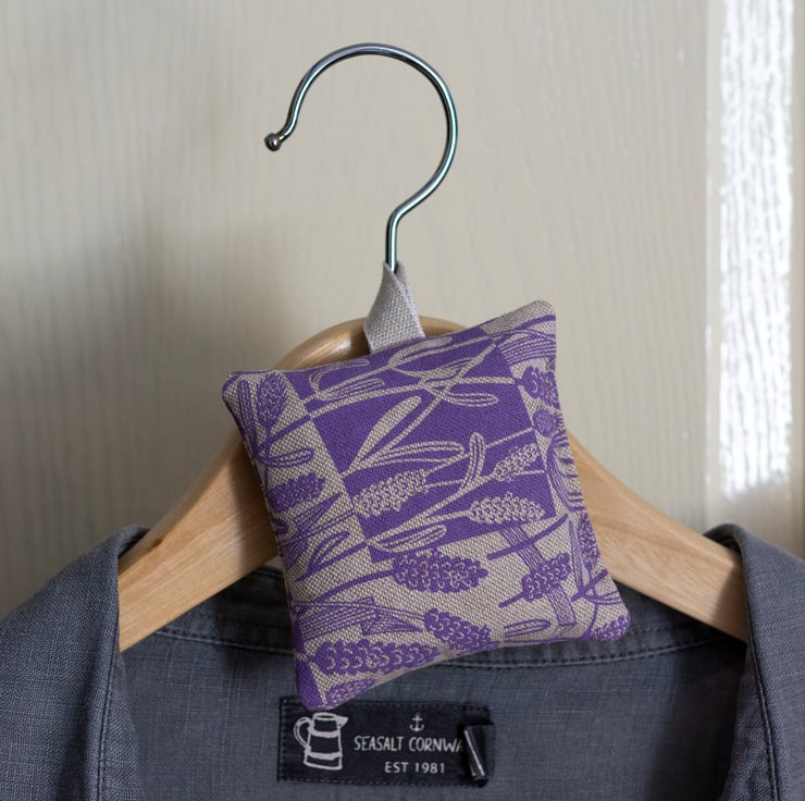 Each bag is made from screen printed linen, with a linen ribbon loop, and is filled with English lavender.