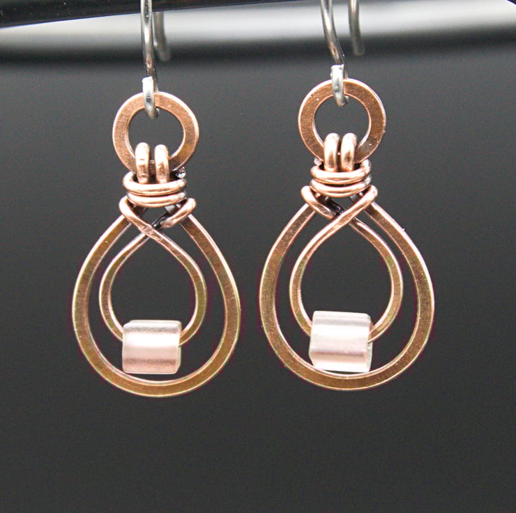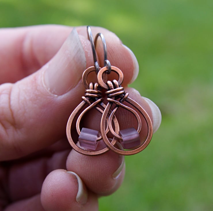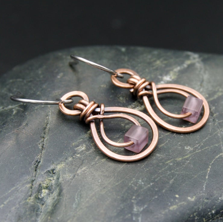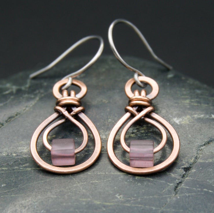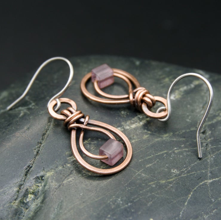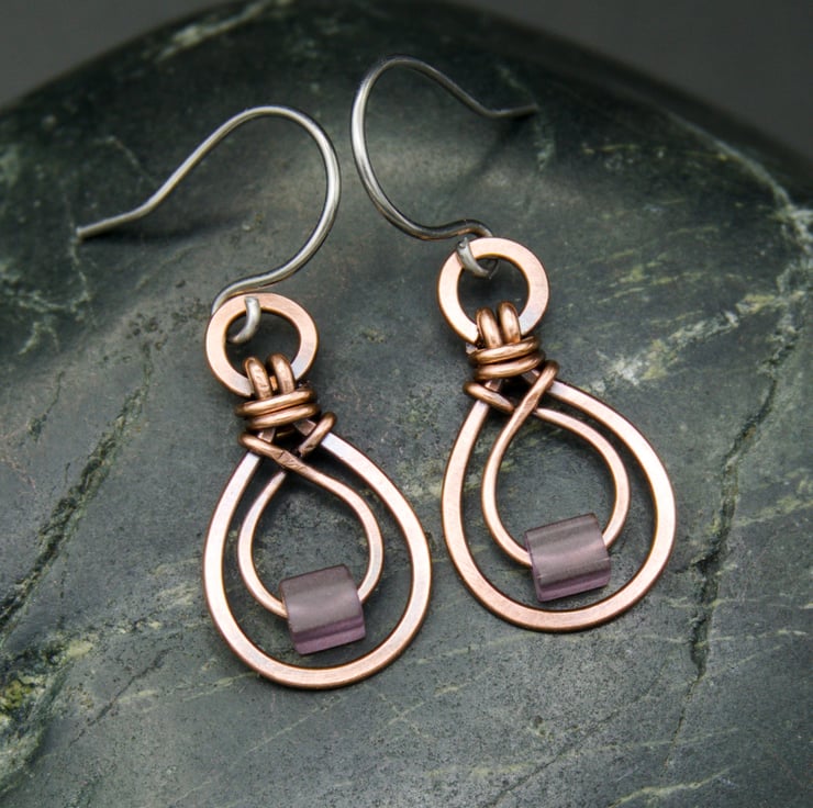 These pretty little earrings have been handmade from copper wire. A hammered teardrop shape has been formed from thicker wire & attached to a ring. The 4mm cube bead sits on a smaller teardrop made from finer wire, which has then been woven inside the larger shape. The beads are a pale purple colour with a frosted finish which looks gorgeous against copper.
