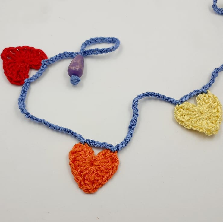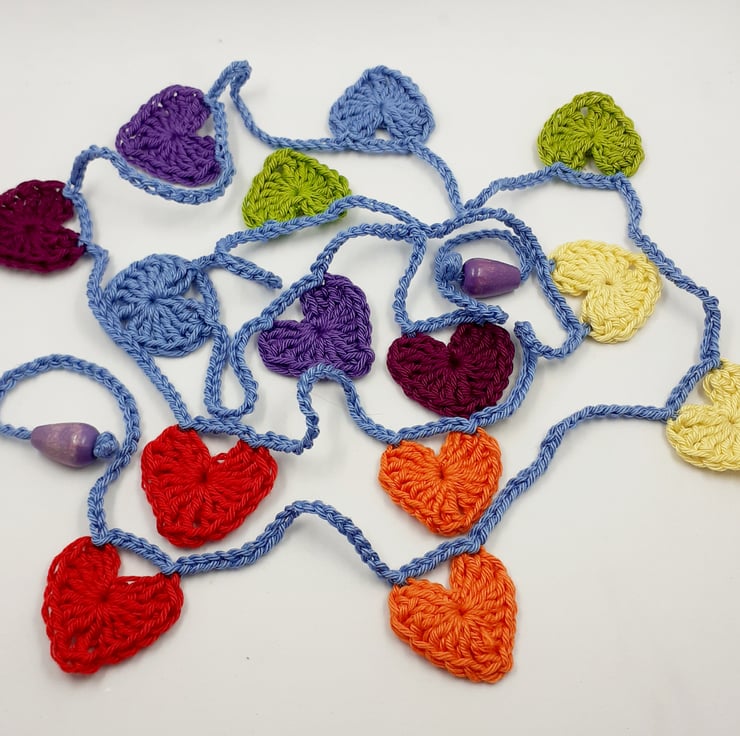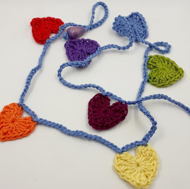 This pretty string of hearts in the colours of the rainbow is crocheted in cotton and finished at each end with a painted wooden bead. The whole garland measures approximately 165 cm long and comes wrapped in tissue in a labelled PIP (Postage in Proportion)box all ready to be given or posted on. I can include a tag with a printed message of your choice if you would like to send the hearts as a gift