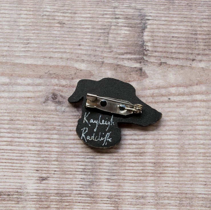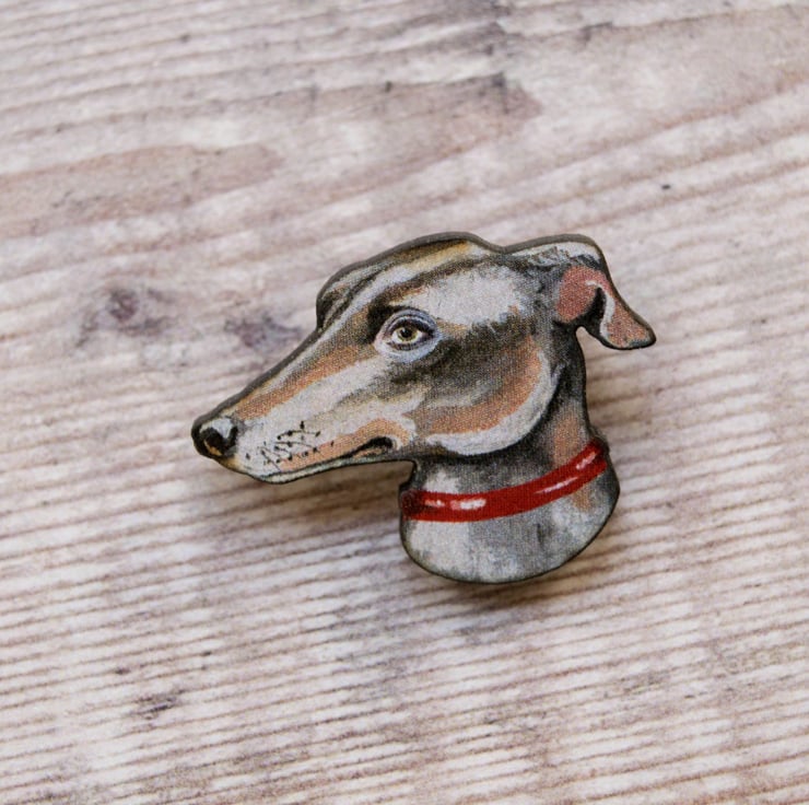A little greyhound/ lurcher/ whippet dog head brooch ready and waiting to be attached to your clothing attire for all to admire!