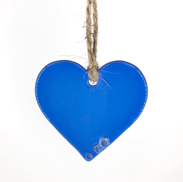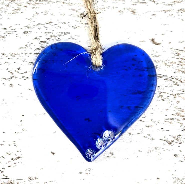 This gorgeous heart is made from a transparent royal blue glass. It has three sparkly silver dichroic glass beads fused on because we all love a bit of bling!