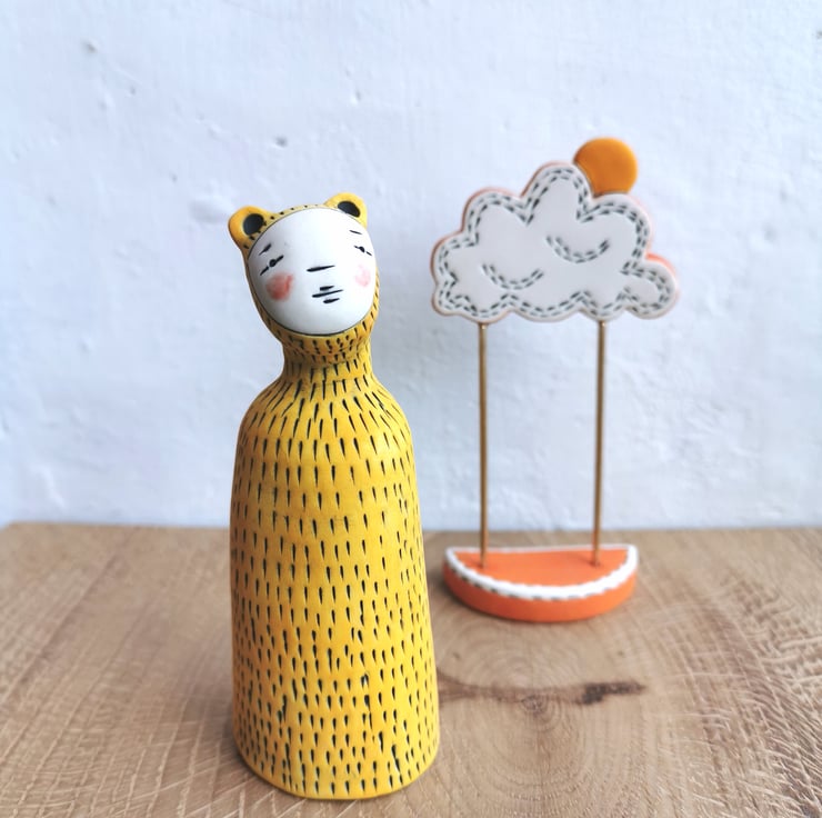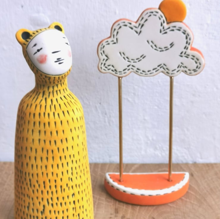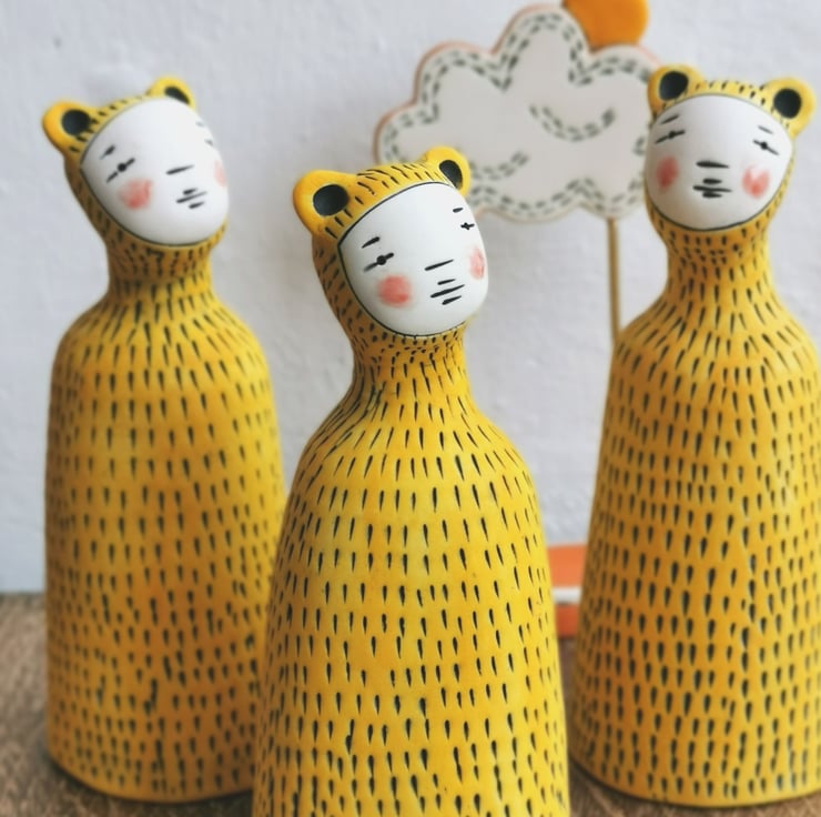 Handmade from semi-porcelain clay, each person is unique, with their own particular personality, expressed through simply impressed incised decoration.