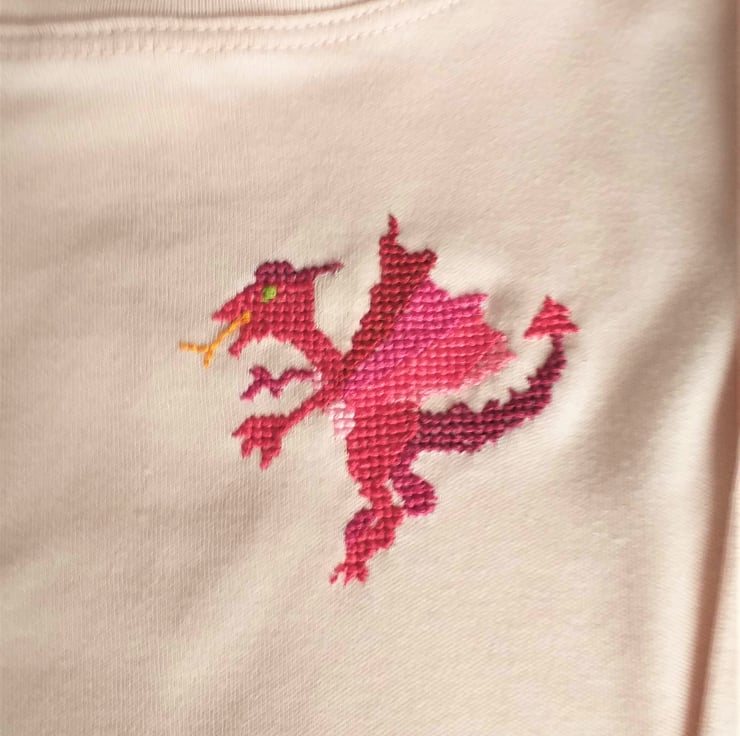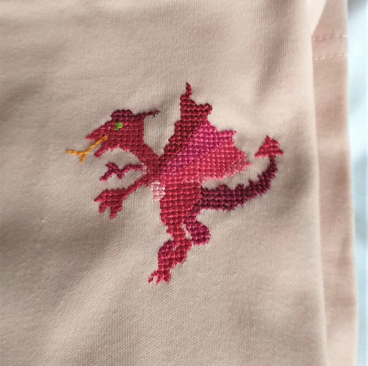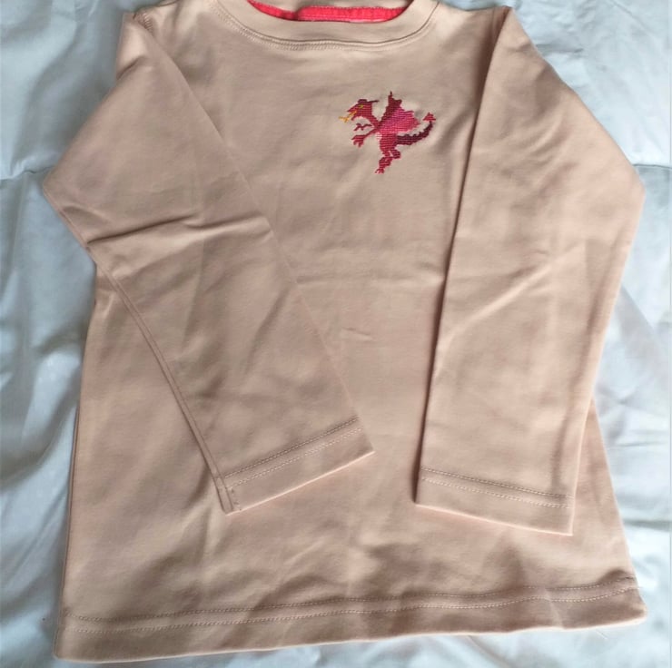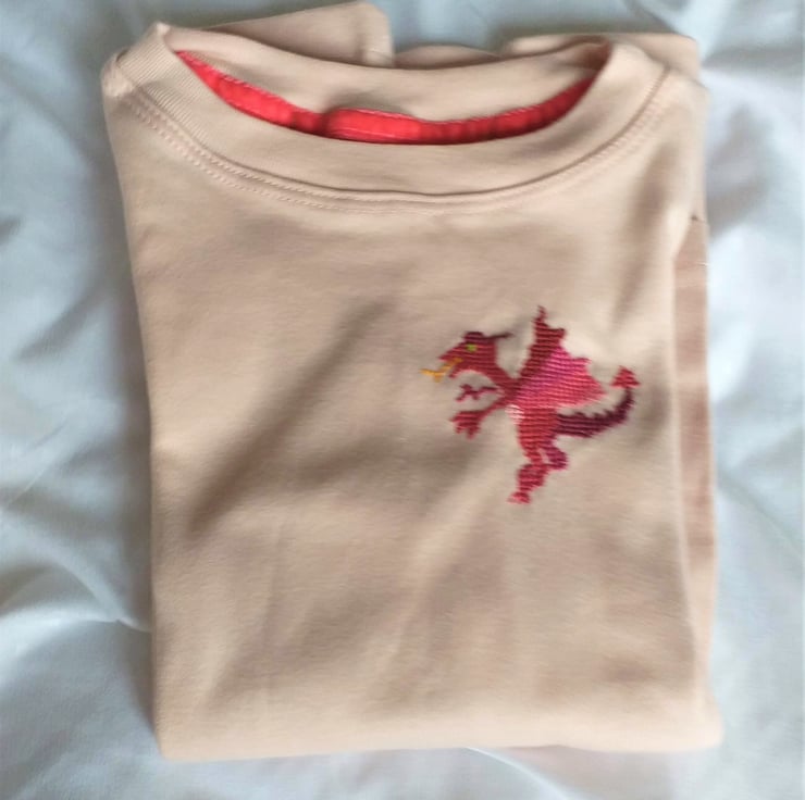 This is a lovely dusky pink, long sleeved T-shirt, for a 6 year old. On the left front I have hand embroidered a dragon in various shades of pink from a sketch of my own. He stands on his hind legs, his tail raised and his wings partly unfolded. A tongue of orange flame leaps from his mouth. I think of him as a young dragon, perhaps learning to fly. The shirt has a soft velvet band inside the back of the neck. As O never use a permanent backing when hand embroidering kids' clothing, there is nothing inside this shirt to irritate your child's skin. It is 100% cotton and machine washable.