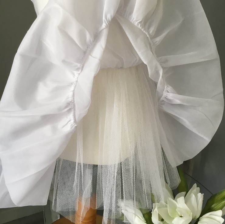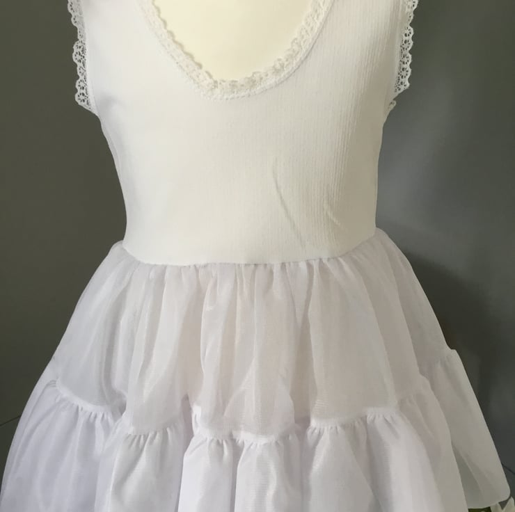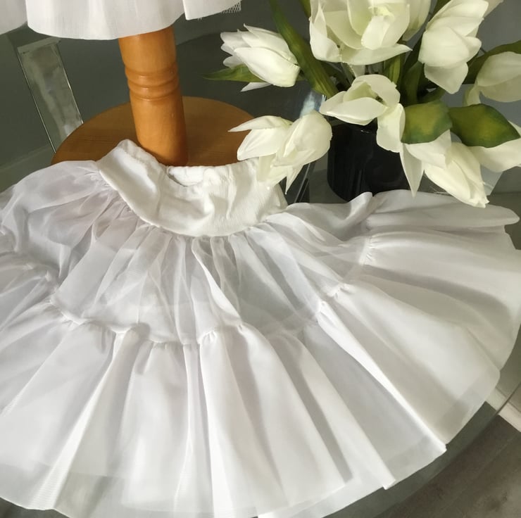 The full petticoats I have are only 2-3 years. I can do them as they are with double nylon skirt flounce, or I can add netting to make it fuller. This would be against child’s legs though.