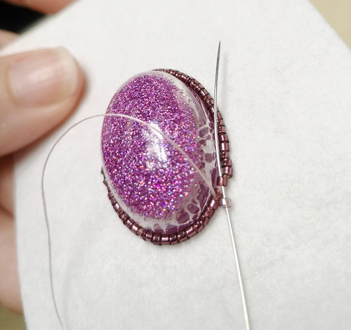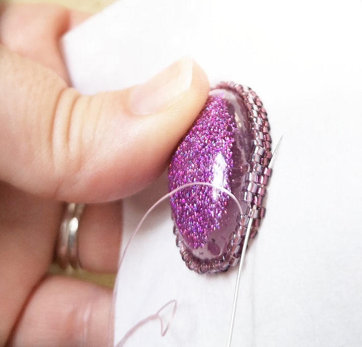 This is a detailed pdf file which includes written instructions and photos of each stage. This is all needle and thread work and I would suggest that you have done some beadwork before diving into this one (such as the bead embroidery cabochon pendant pattern). Stitches include a circular peyote around the cabochon and a beadwork bail using peyote stitch.