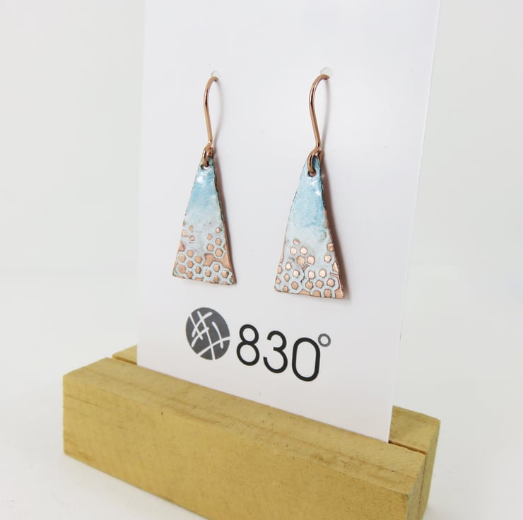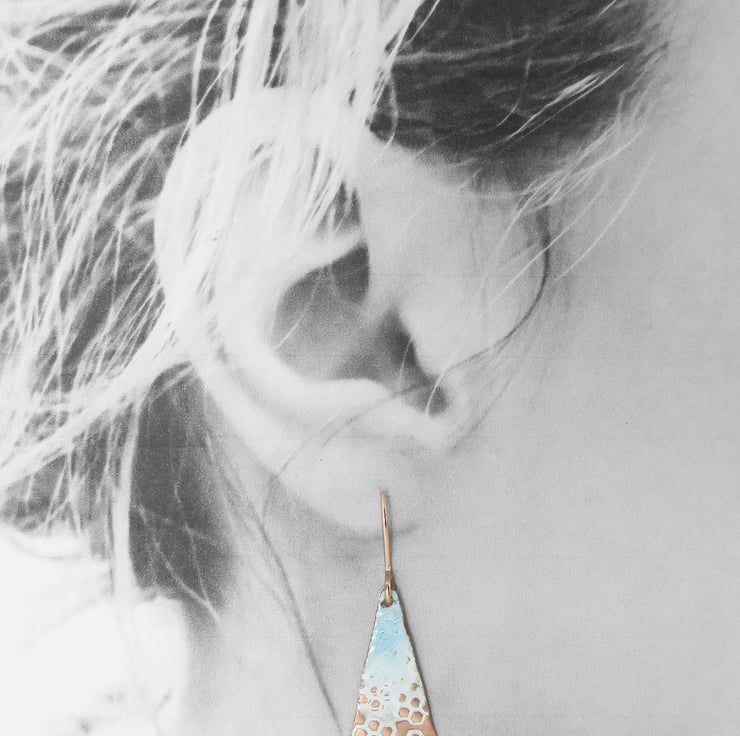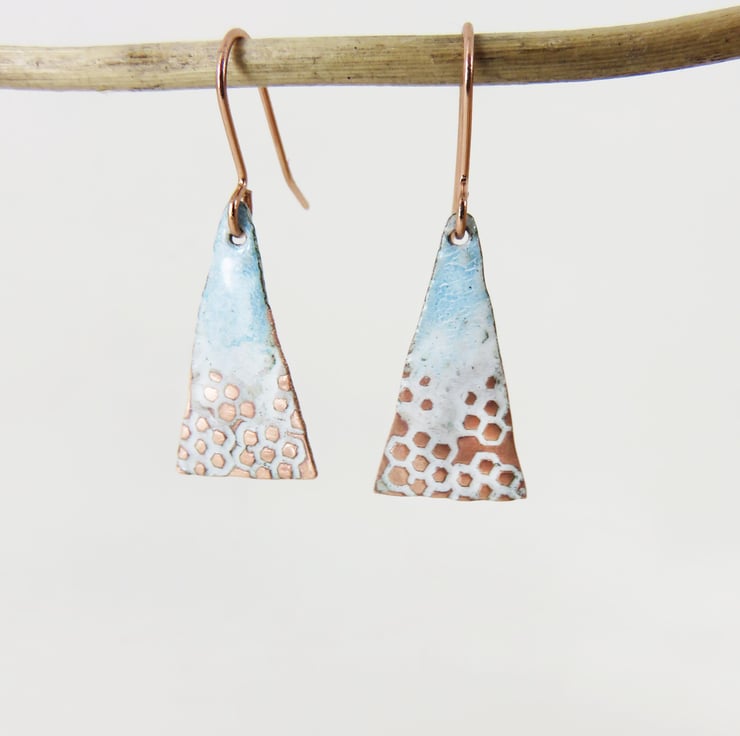 25mm long by 13mm wide triangles of copper are textured by hand with my metal stamps and a wash of white and sky blue enamel applied across the texture. The copper areas have been polished. The wires are rose gold plated. Fired in the kiln at 830 degrees. Unique.