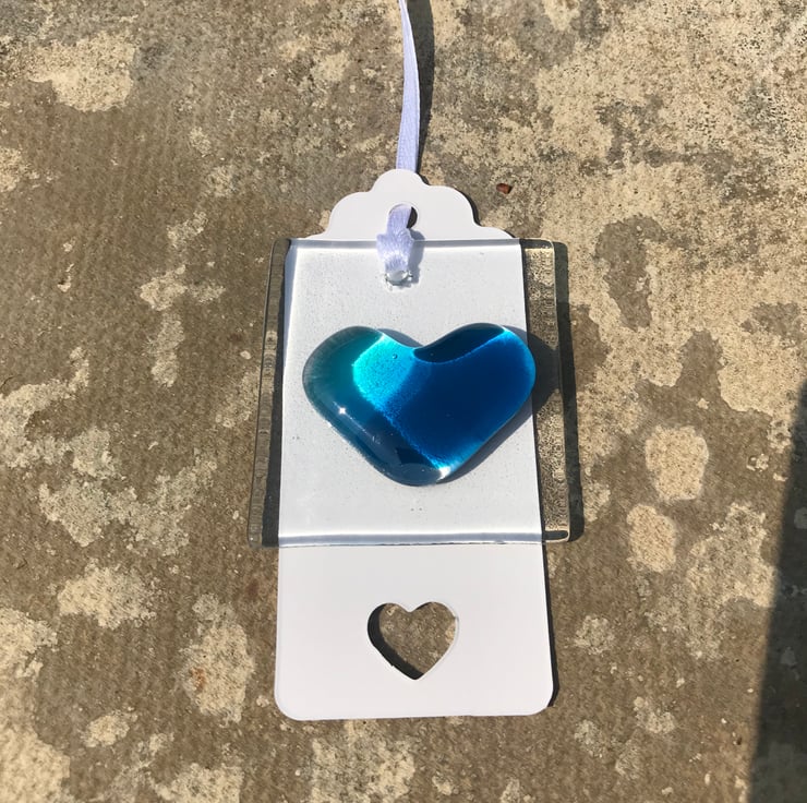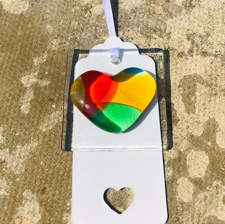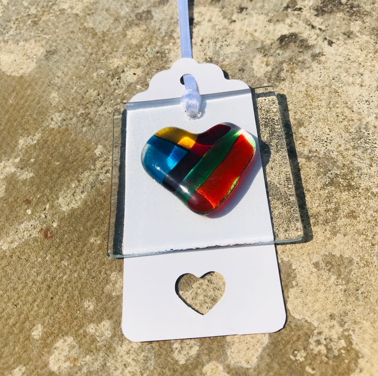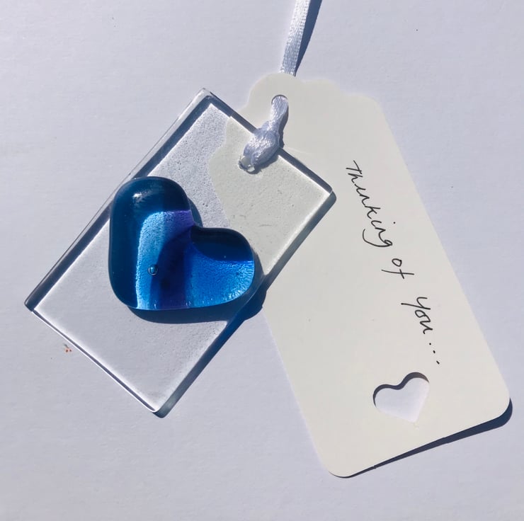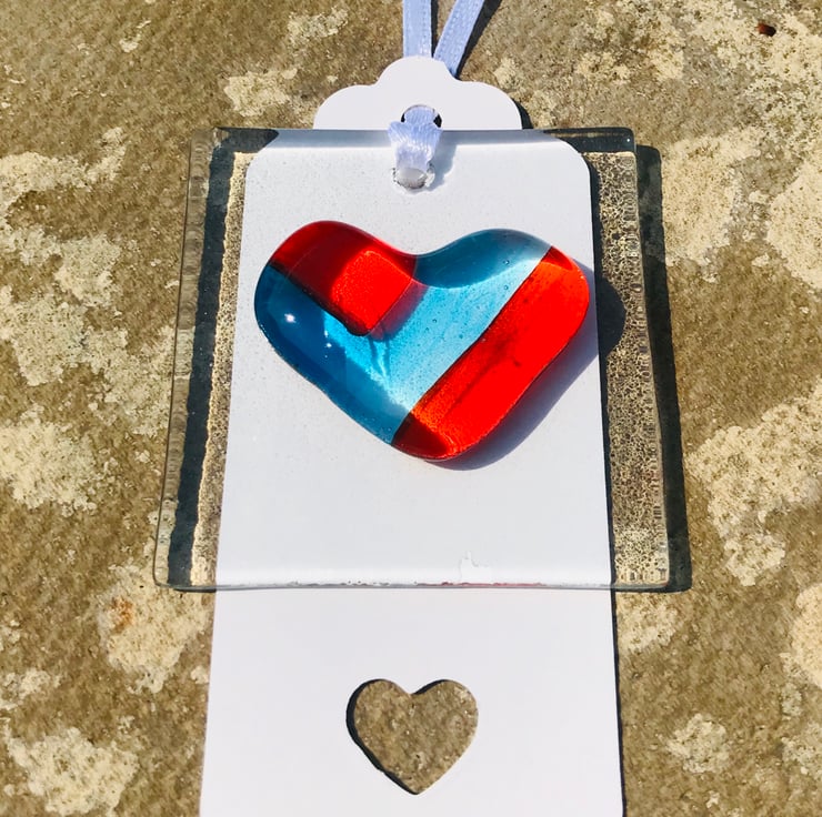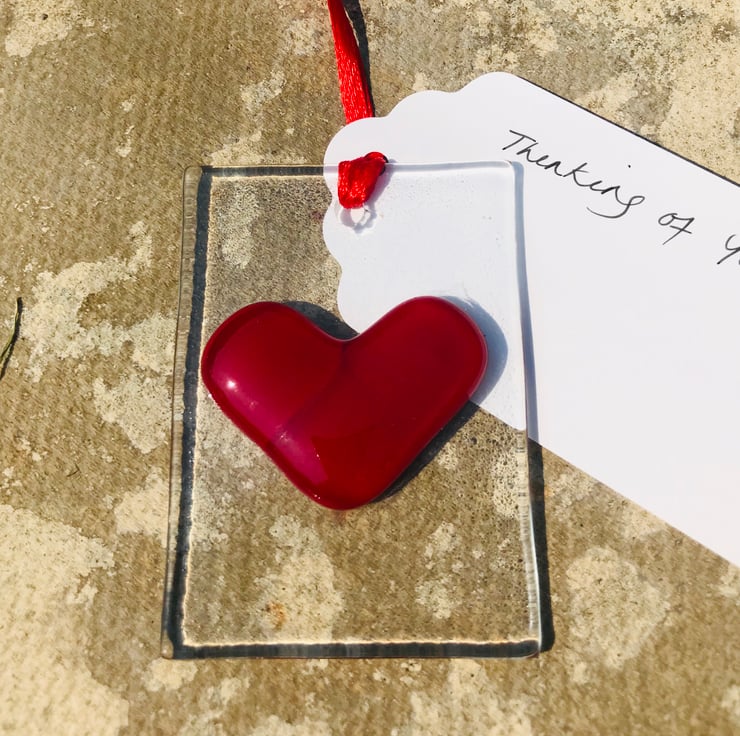 Let someone know that you are thinking of them with this beautiful hand crafted fused glass heart hanging with gift tag for your own message . Measures 7cm x4 cm . A perfect gift to let someone know your thinking of them .