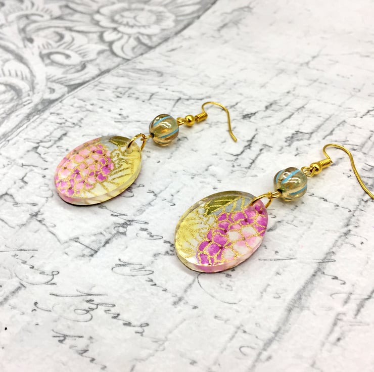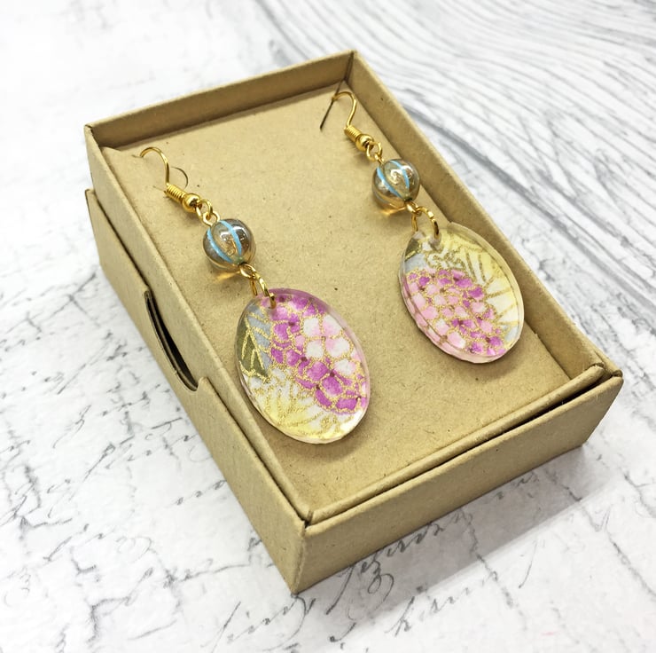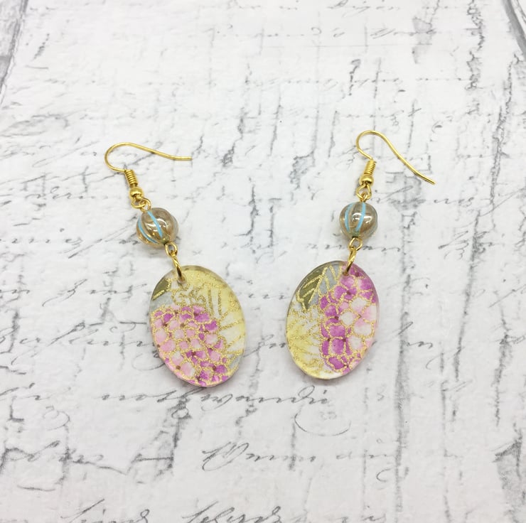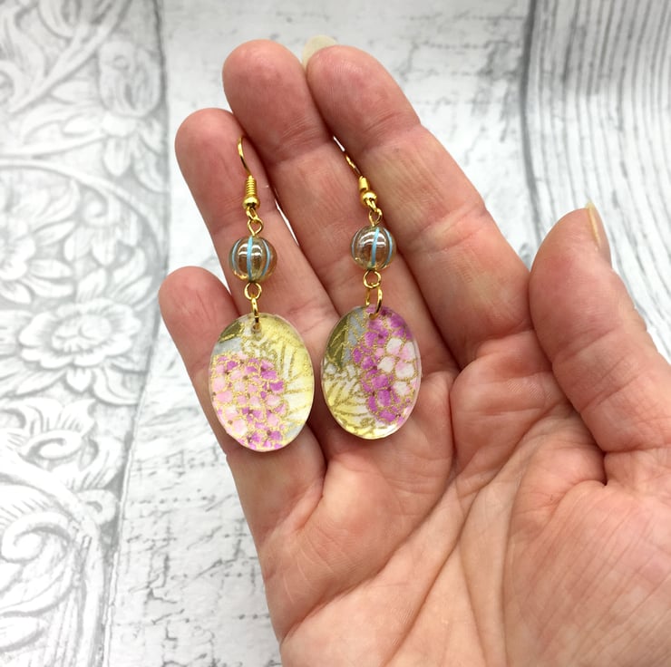 These unusual handmade floral earrings are a combination of pretty hydrangea patterned Japanese Washi or Chyogami paper and clear acrylic oval shapes!