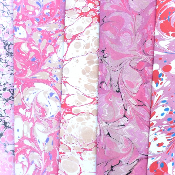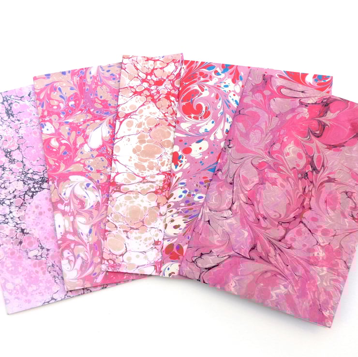 This listing is for a beautiful set of 5 printed A6 folded blank note cards featuring 5 different printed marbled paper patterns in a pink and red colourway. Now on sale as they have old information on the reverse.