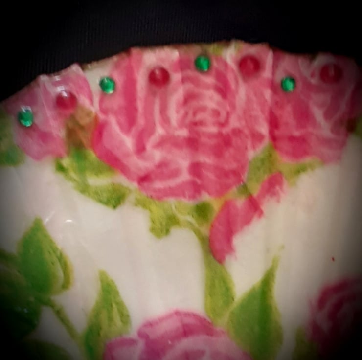 This is a very unique and beautiful scallop shell trinket dish suitable for jewellery or trinkets but can also be used as a tealight holder The Scallop shell has been collected in Cornwall and has been decoupaged with a lovely vintage rose design illustration...and has also been embellished with pretty acrylic beads and a bronze decorative metal embellishment ....the shell has been well protected with several layers of waterproof varnish. ..the overall measurement of the shell is approx.3 and half ins long and 4 ins wide at its widest point