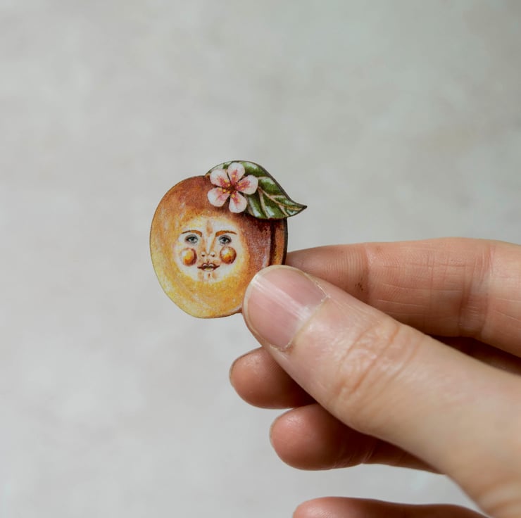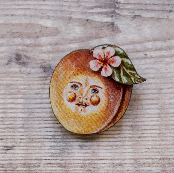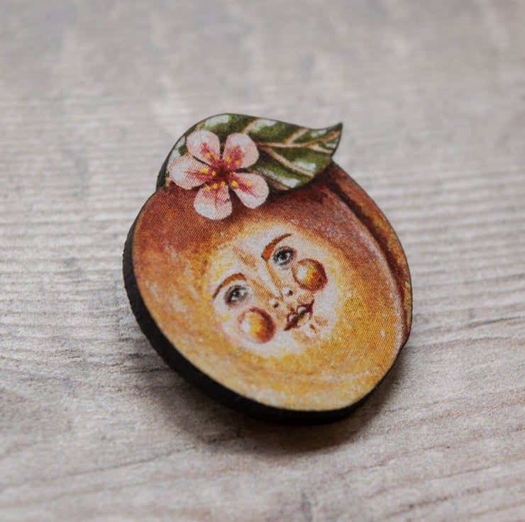This is peachy Pete, a printed laser cut wooden brooch. He will look fabulous pinned to your clothing for all to admire. Why not gift him to a loved one?