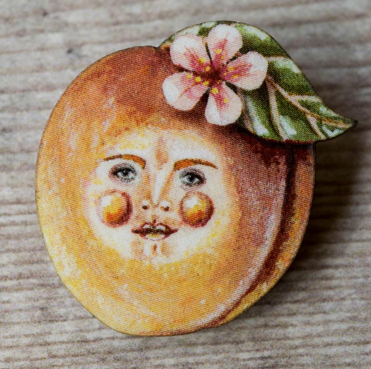 Peachy Pete now has a gloss coating to enhance his beauty. He is plain wood on the reverse. A brooch bar pin is attached to the back of him so that you can pin him to wherever you like.