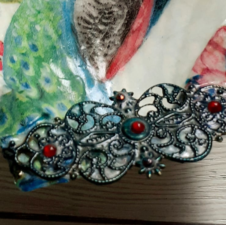 This is a beautiful handmade trinket dish using a Cornish Scallop shell ..this dish could also be used as a tealight holder......the shell has been decoupaged with a very pretty peacock illustration ...the dish is also embellished with acrylic beads and a decorative blue/ silver tone embellishment ...the dish has been well protected with waterproof varnish the overall measurement of the dish is 3 and half ins long and 4 ins wide at its widest point