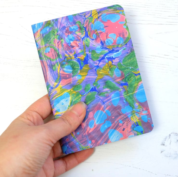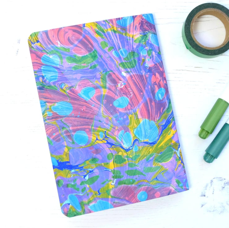 This listing is for a super bright and colourful little a6 notebook covered in some of my own marbled paper.