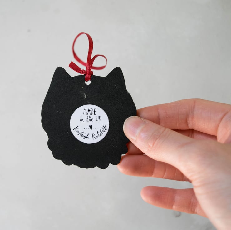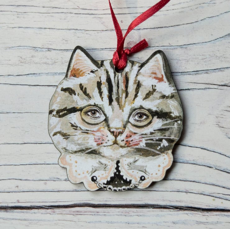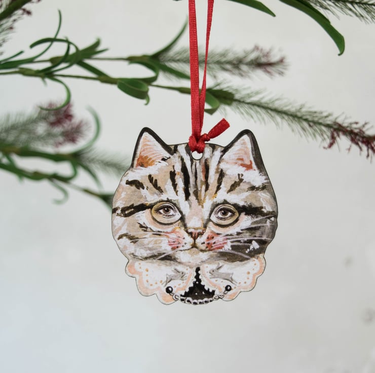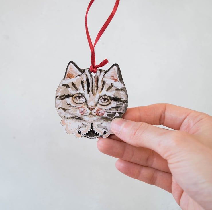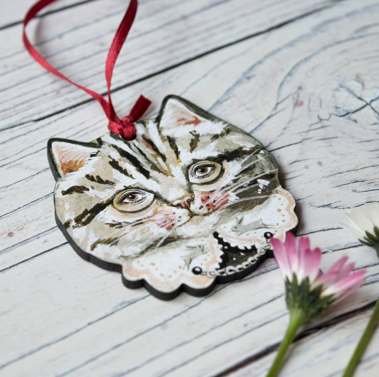 A pretty grey tabby cat hanging decoration, made from laser cut wood.