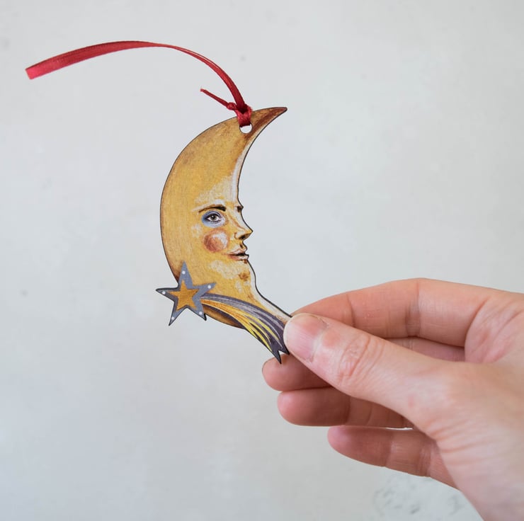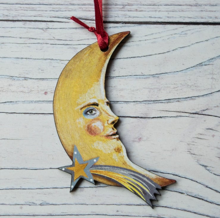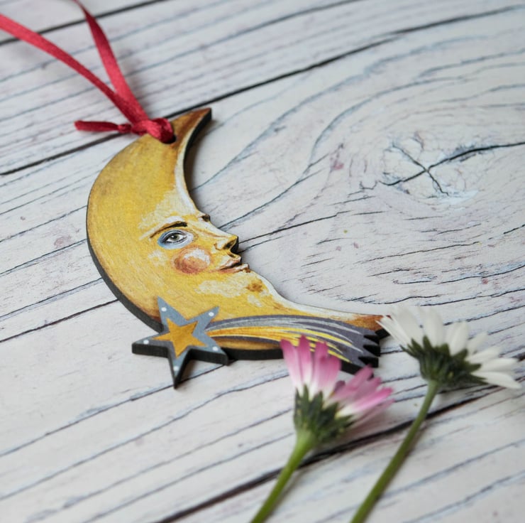 A delightful crescent moon face with a shooting star, made as a hanging decoration from laser cut wood.