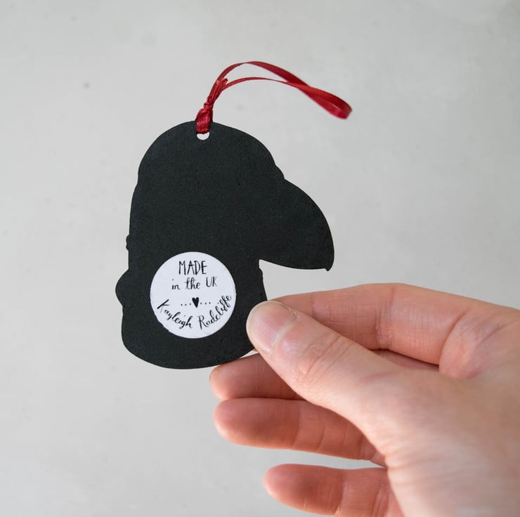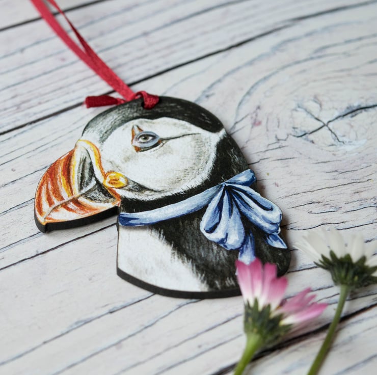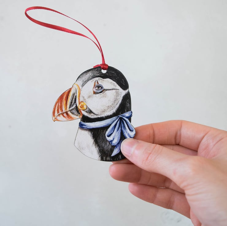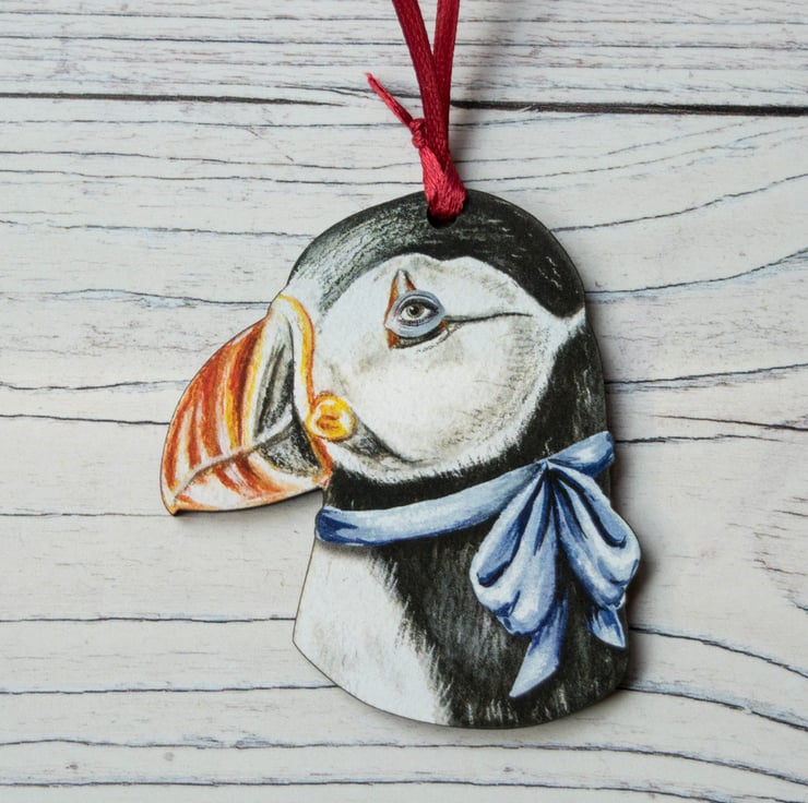 A delightful puffin bird hanging decoration created from laser cut wood.
