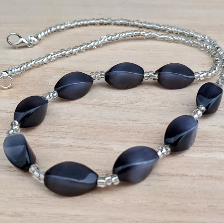 Simple minimal 18.5" necklace of 15mm twisted smokey grey acrylic beads, and silver seed beads.