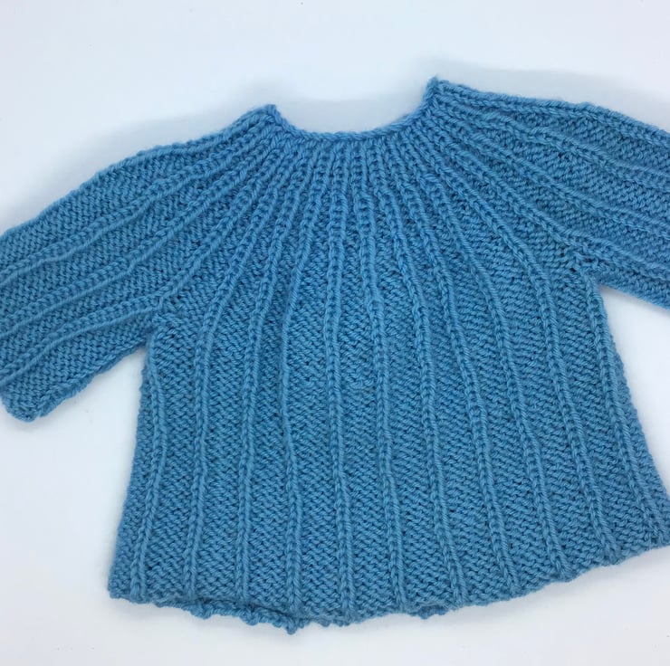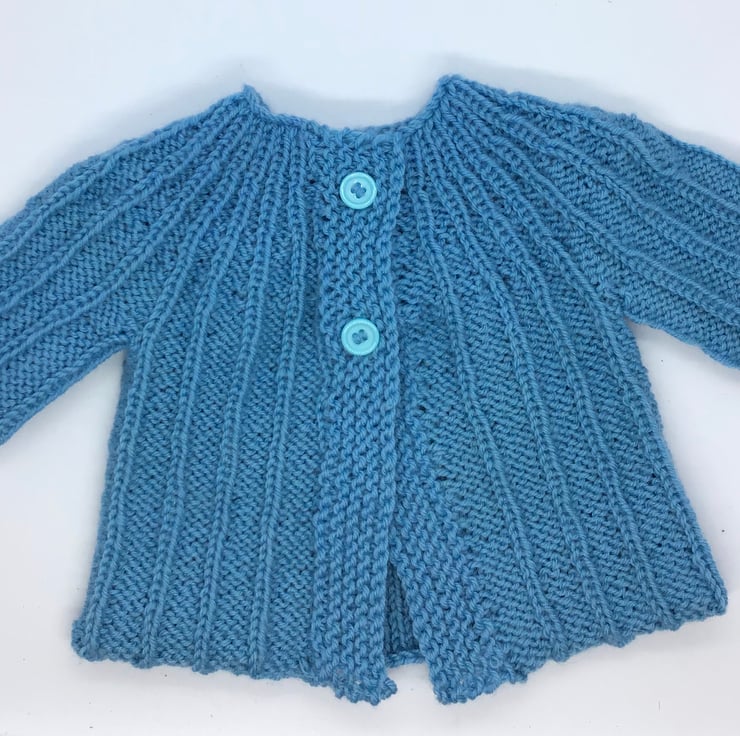 Light turquoise baby cardigan to fit size 0-3 months approximately. A modern ribbed design with 2 buttons. Hand knit in 100% anti tickle merino wool. Made in Lancashire.