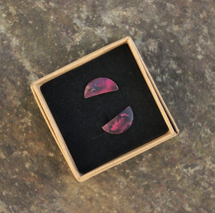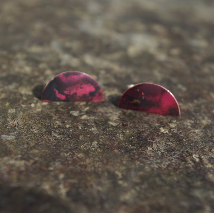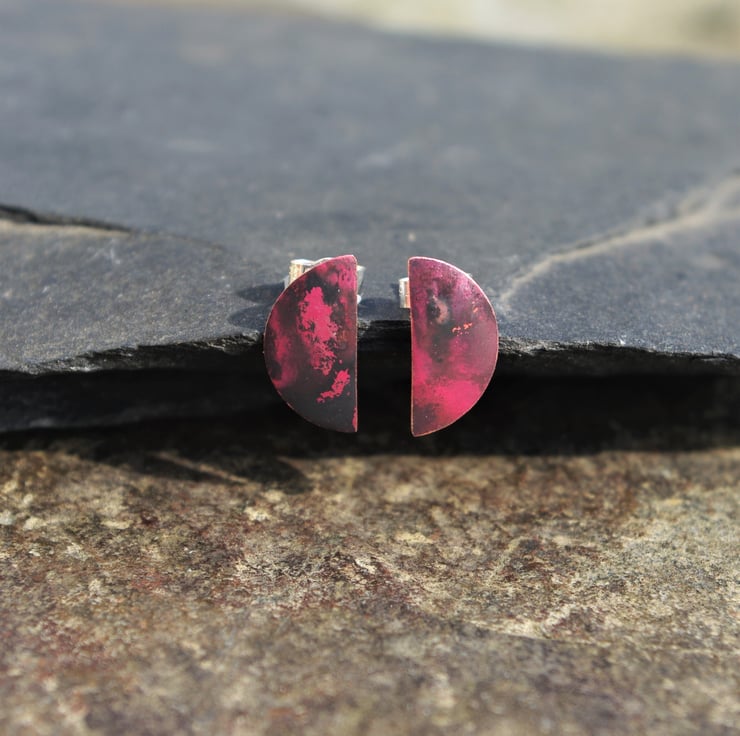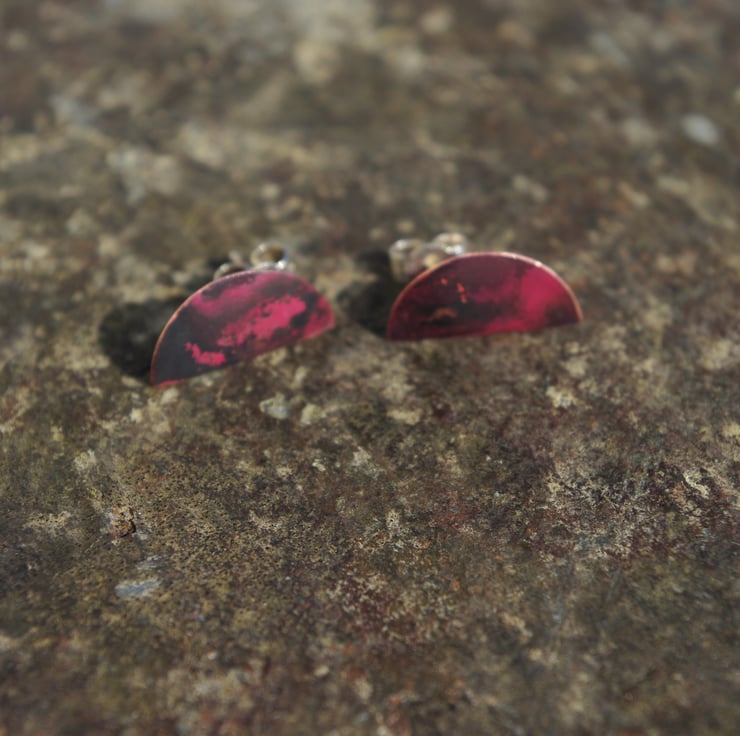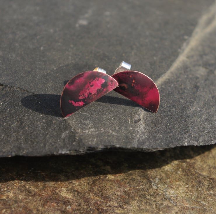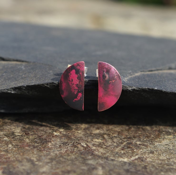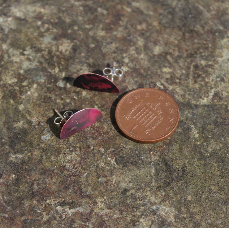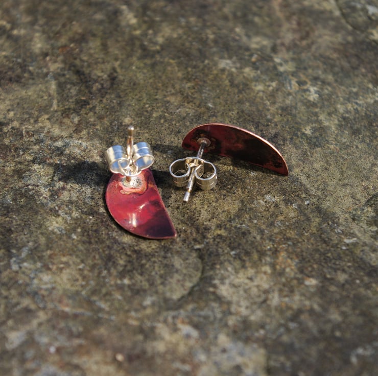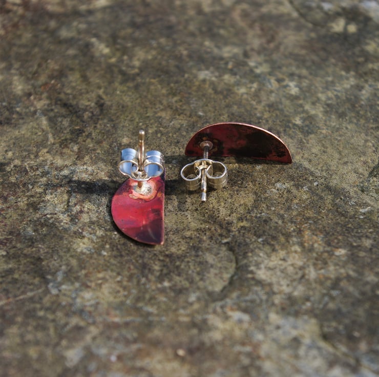 I have cut out half moon shapes from copper sheet , to a size that the earring hangs down just off the earlobe. The copper has a mix of shades of dark red, purple and black as a result of a heat process; giving unique results, always exciting and unpredictable. The red tones are brighter in daylight. They can be worn so the curve is on the inside or the outside and have a length of 15mm/ just under three quarters of an inch; smaller than a penny.