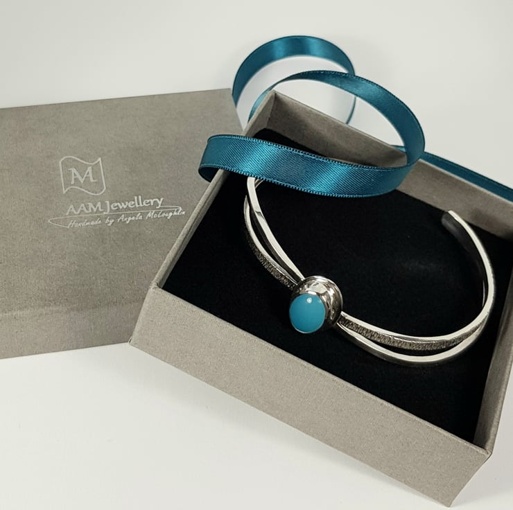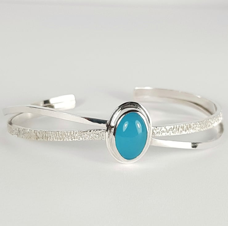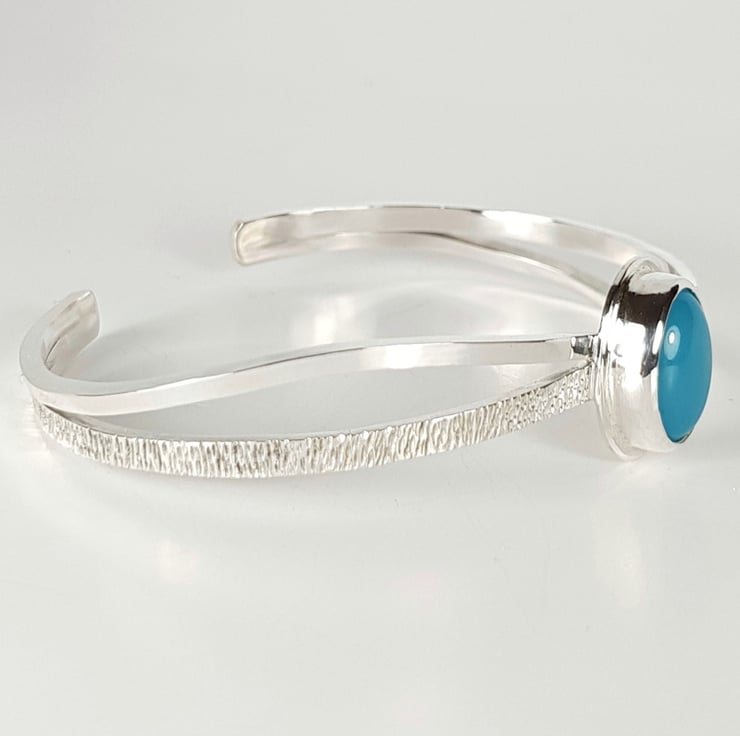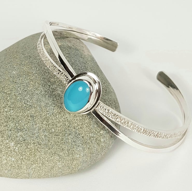 The bangle features a gorgeous blue chalcedony stone. Chalcedony is believed to enhance feelings of goodwill and generosity and dispel negative thoughts and emotions.