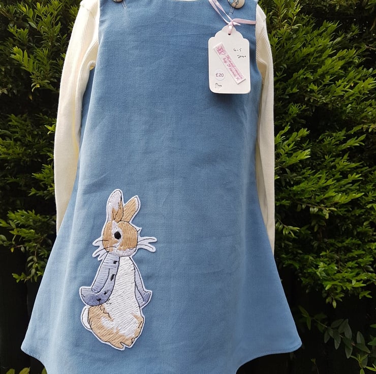 A fully lined pinafore A-line dress. Made from pale blue baby needlecord with Peter Rabbit™ detailing and coordinating buttons. Can be worn with a long or short sleeve T for colder days.