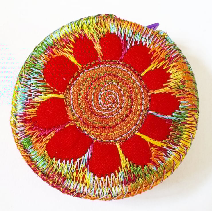 Made from layers of fabric including hand dyed Egyptian cotton and silk fabrics using the free machine embroidery style of sewing