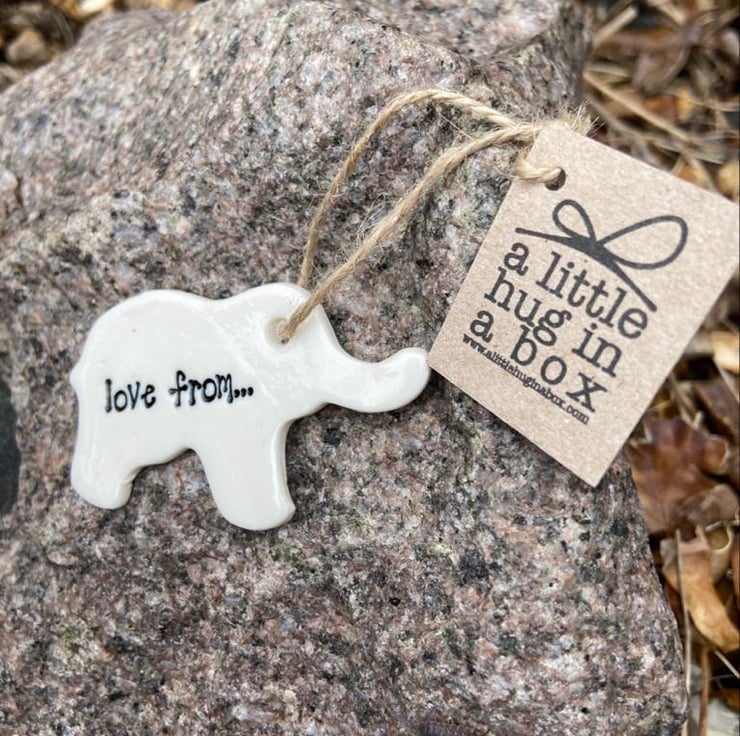 The little hug in a box range from Funky Zebra is a range of small thoughtful gifts for you to send in the post to let someone who you can't be with at the moment know that you are thinking of them. Each of these little elephants is handmade in white porcelain with an embossed hand painted "with love from" message in black and measures approximately 4cm x 7cm. Please note that the postage cost includes the A little Hug in a Box gift box and tag