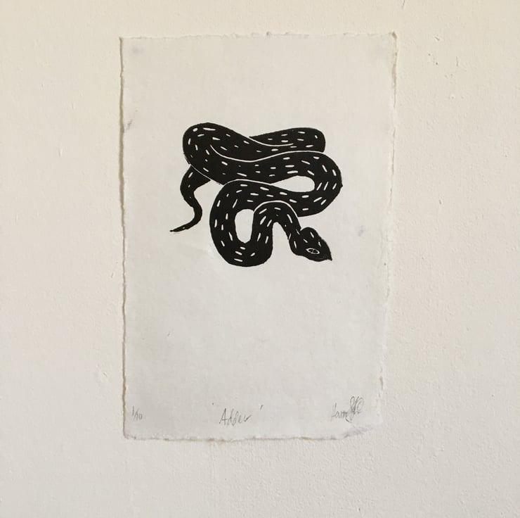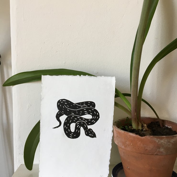 A small linocut print in black ink on handmade paper.