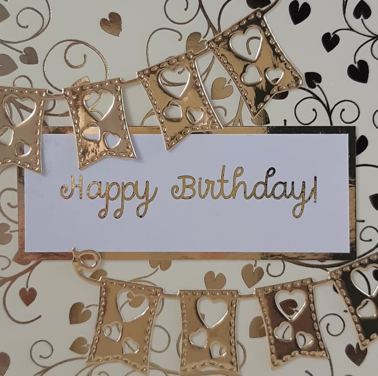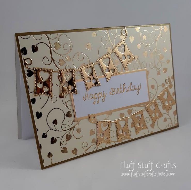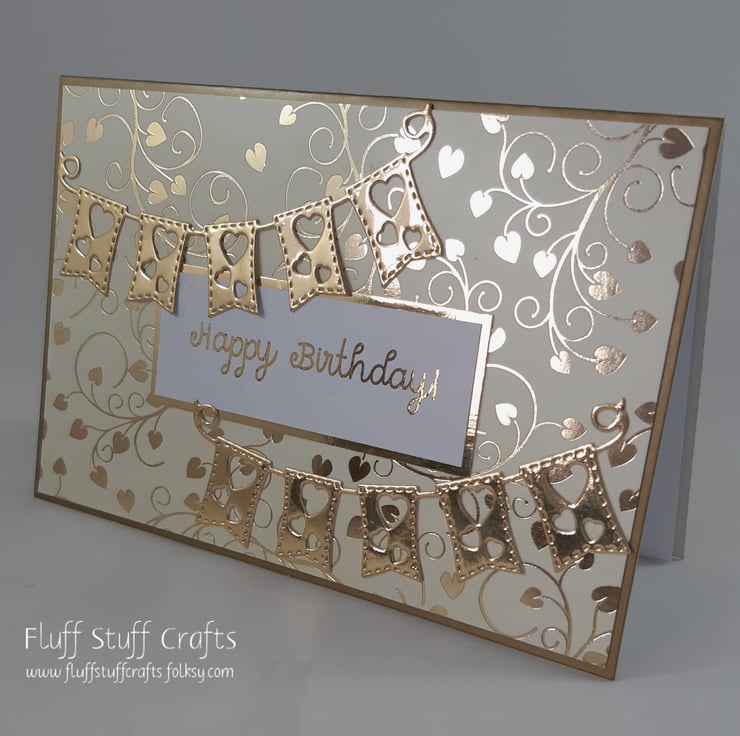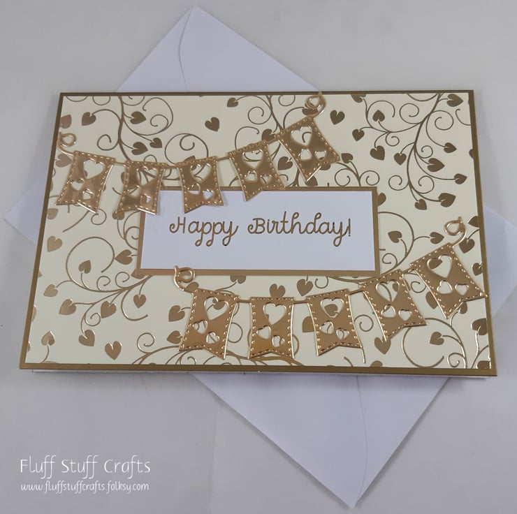 The card has been embellished with two pieces of die cut bunting, again in gold mirri card.