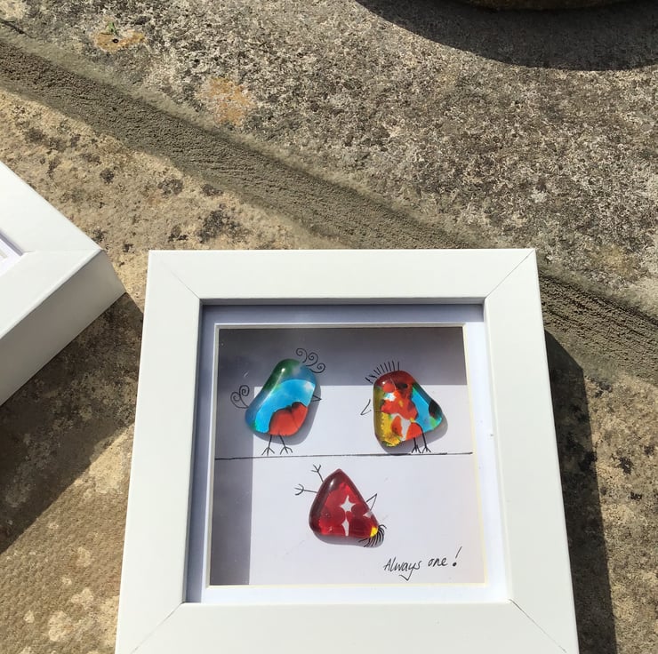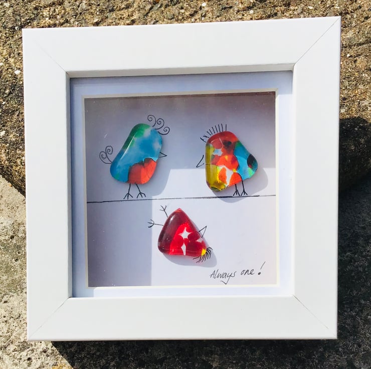Fused glass birdie always one. Is fun bright and quirky . I make the glass birds in my home kiln . Sure to bring a smile to your face . The picture is in a 10cm square frame and is easy to hang