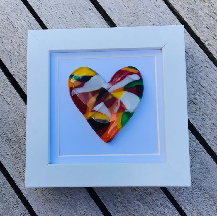 10cm square boxed framed cast heart . Each is unique . I make them in my kiln and each takes around 12 hours to make in the kiln. Beautifully shiny and light reflective . Perfect to brighten your home or as a gift