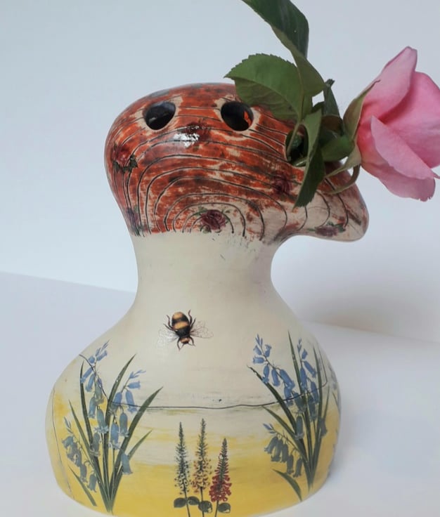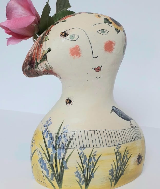 Hand built by coiling this figurative vase measures 23cm approximately. Painted and decorated with coloured slips and glaze in a transparent glaze glaze.Ceramic decals of bird,bugs and flowers are fired on to add detail .Openings at the back of her head allow for dried flowers or grasses. Will be carefully packed and posted.