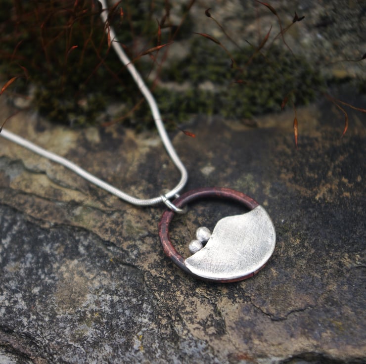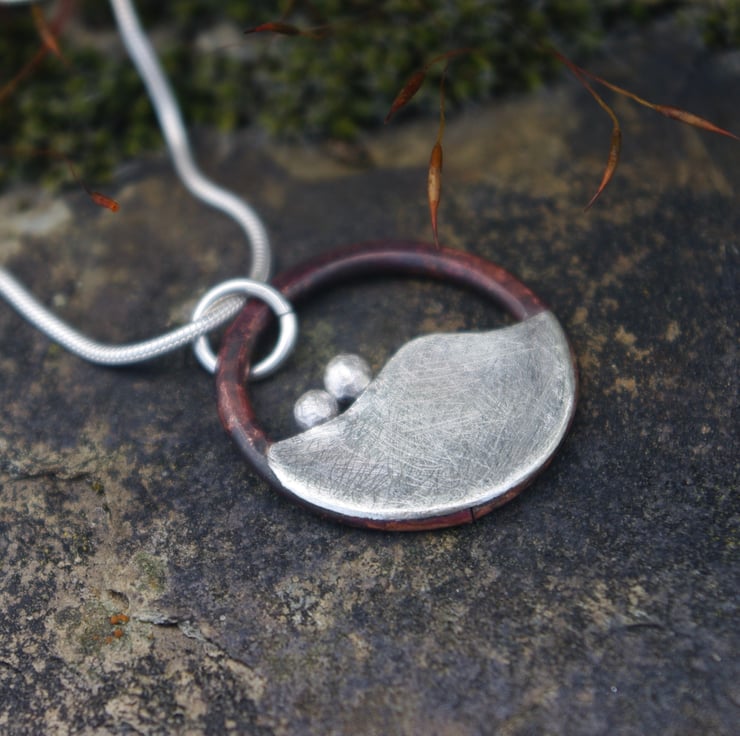 I have made a circular pendant inspired by the hills outside my window . The blobs of silver reminiscent of the bushes dotted along the tops of the hills . The outside circle is made with copper ; the deep red tones achieved by the application of heat . The hill is made from sterling silver and has a matt/frosted texture to contrast with the copper. The pendant is designed to move about , so that it won't always hang with horizontal , and so sometimes it's an equally interesting abstract necklace. It can be worn both sides; one side has the copper circle as a 'frame' ; the other side has the silver hill shape right to the edge of the pendant without the copper surround.